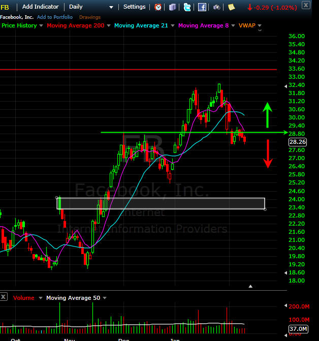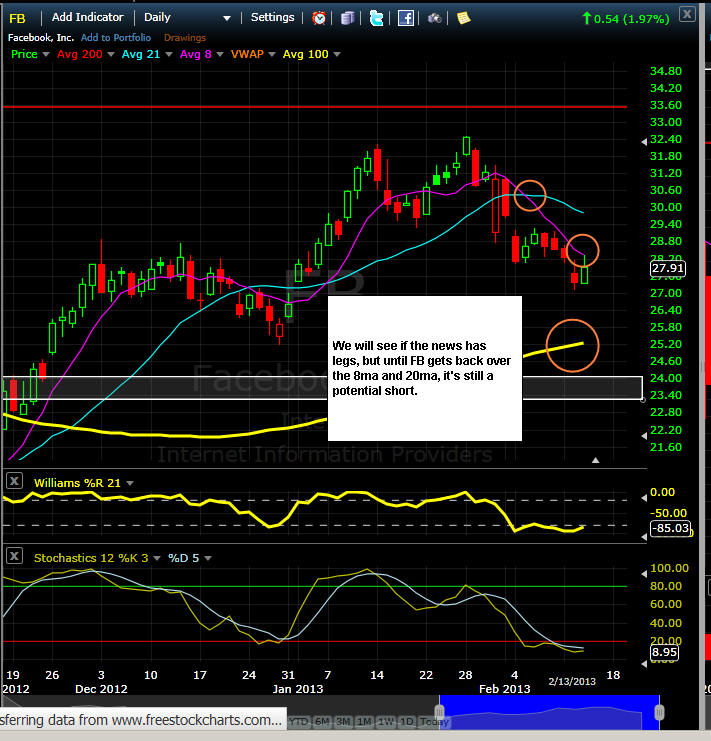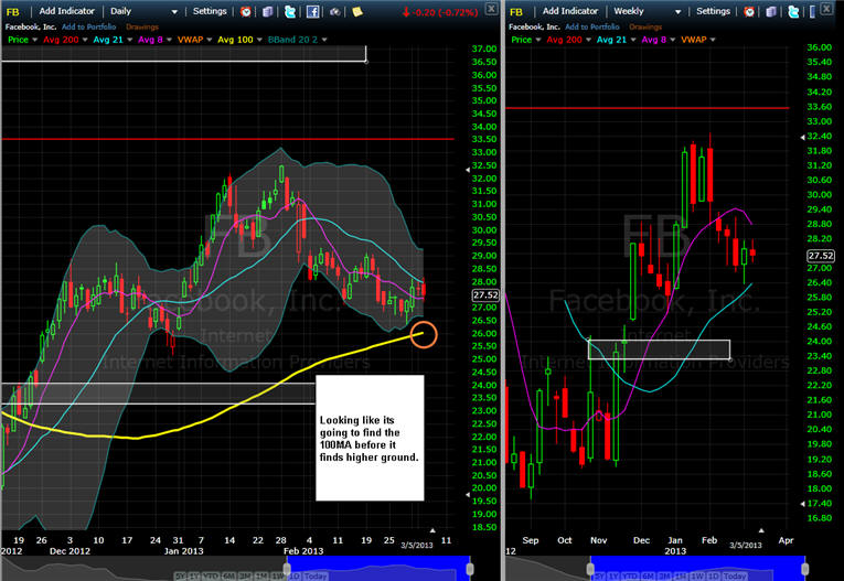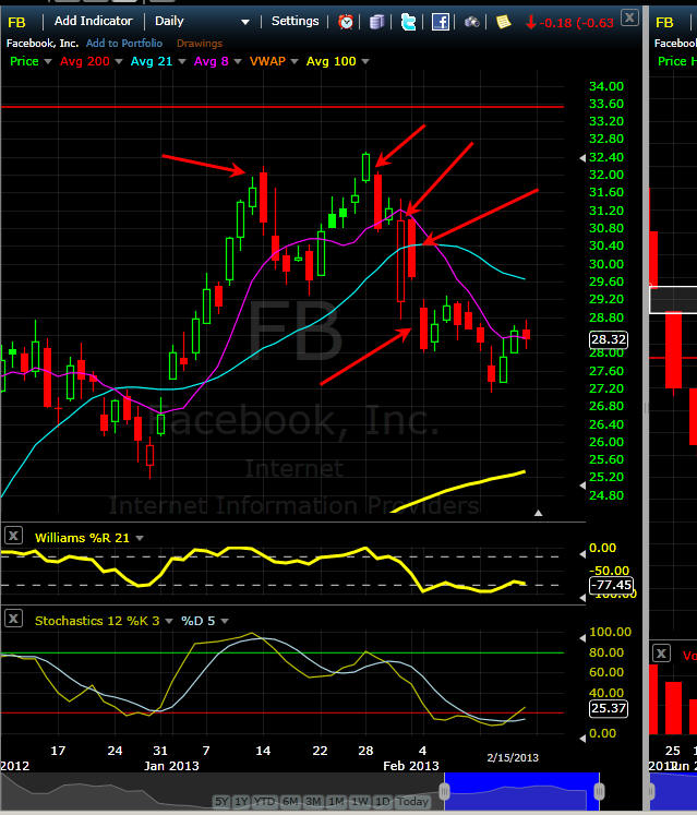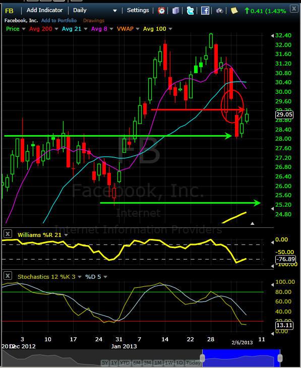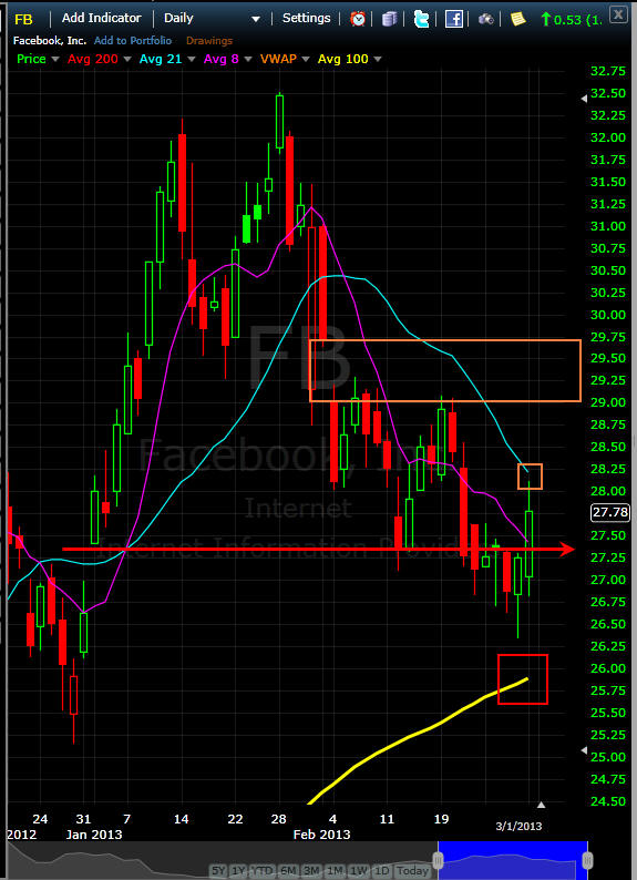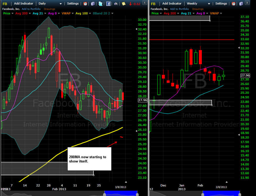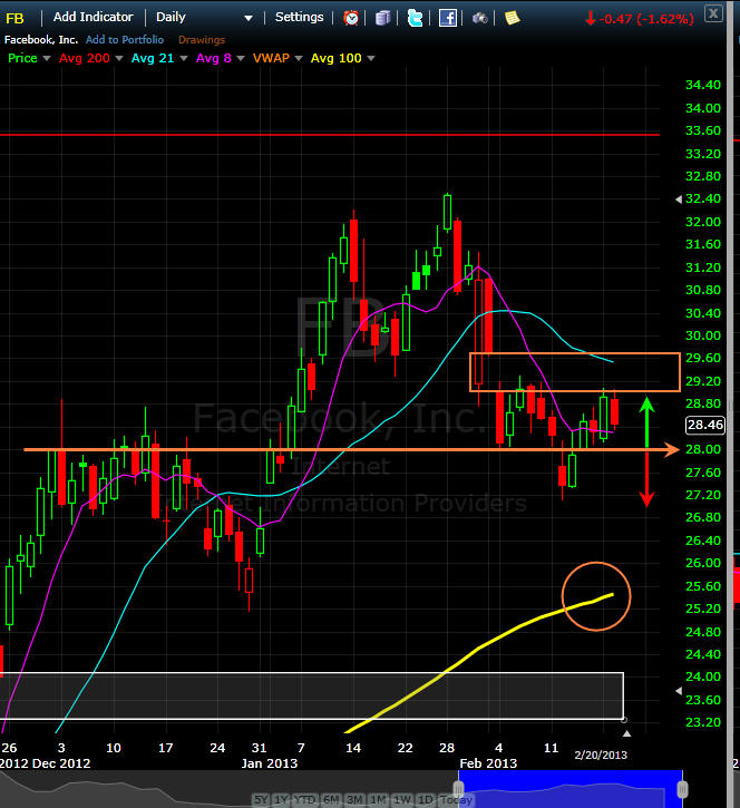 ================================================================================================ 2/20/13 - Breaking down with the markets...maybe. When the markets tend to sell off, some stocks actually go up and FB could be one where investors want to put some of their profits to work. Generally, when big cap stocks start selling off due to profit taking, money rotates to other stocks. If FB holds ground at $28.00 I would say its time to get more long positions. I sold my MarWk1 when everything turned the corner today but will get back into Mar monthly options if FB holds $28. If it fails, then I am looking at the 100MA on the daily as my next solid entry point.