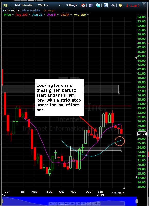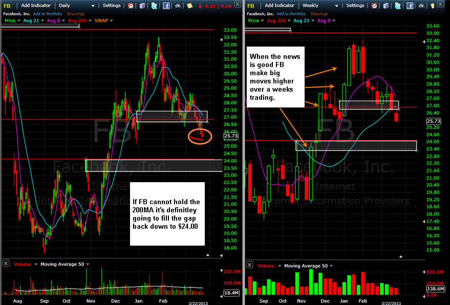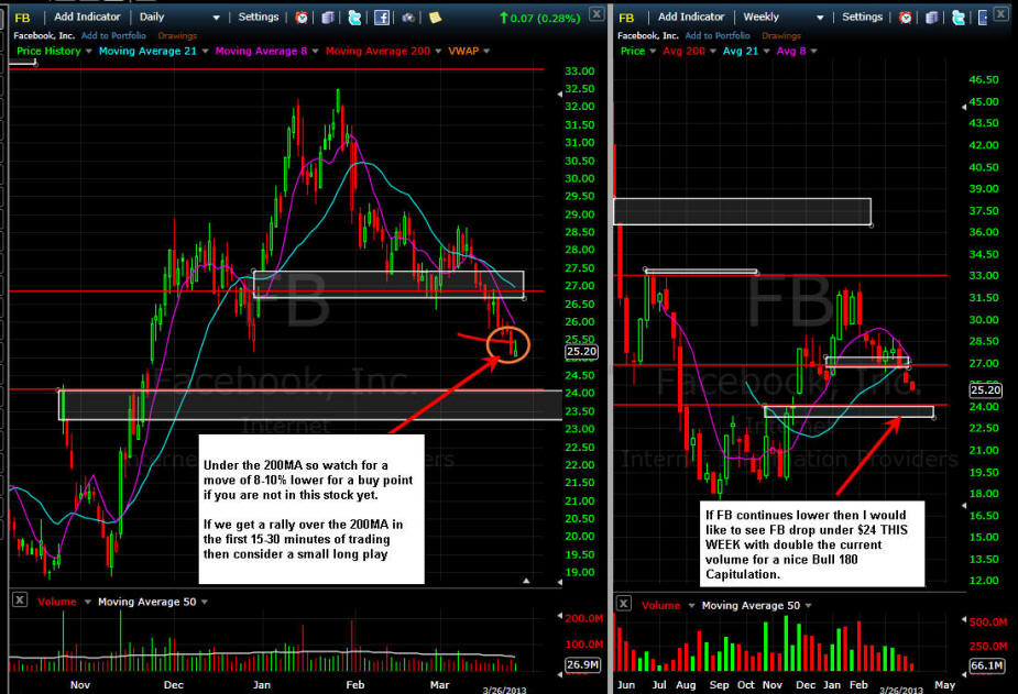 ========================================================================================== 3/23/13 - FB is still selling off and testing it's 200MA on the daily chart. The volume is still light so I would be looking for a capitulation day if we continue to fall back. Support is at $24.00 for a bigger drop and then at $22.00. FB is now in the middle of the gap zone from Aug 2012 so you know the technical investors are watching close for any signs of life. I suspect a measured move is close so if you like this stock for the long haul, just keep selling naked puts and collect as much rent as you can. FB does like to sell off in 3-4 week chunks, so there is a high probability of going lower this week. Of course, any "good" news and FB will snap back with a vengeance. Just look how much is has moved in the previous weeks off good news. When FB gets a good news story, it will make nice moves higher in a weeks time. So if next week starts out with a green bar, get long because this stock has pulled back for 8 weeks (Fib number) and this is looking like a decent Level 2 Bull 180 setup to me. I would prefer to have seen last weeks bar longer, but if FB starts the week off in the green, I will sell some more naked puts and/or a bull put spread since I already have shares long. When FB does move it tends to make up to a $4.00 move in a week so I am going to also pick up some Weekly 27 Calls as a lotto play just in case FB catches a bid this week.