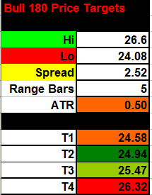 ================================================================================================ 3/26/13 - Still no love for FB. Now that the stock is trading under it's 200MA it is vulnerable to ever greater selling. With the markets still making new all time highs daily, FB is capable of catching a bid and if that happens, the shorts will cover. The best upside target I can predict is the 20 MA at $27.00 unless there is a big news event. Downside support is still at $24.00. As for the Level 2 Bull 180 setup, its now a Level 1 for me until FB can put in a wide range bar to the downside. Since the multi day topping out at $32.00, FB in now in it's 8th week of reversal and the 8th red bar on the weekly chart, so I suspect we are very close to a bounce. What we need is a nice capitulation day to blow out all the stop losses and give the bears the profits they want to take. Then we can jump in with bigger size for a rebound rally. For now, I am still in my positions looking for an opportunity to add more shares as I make profits.