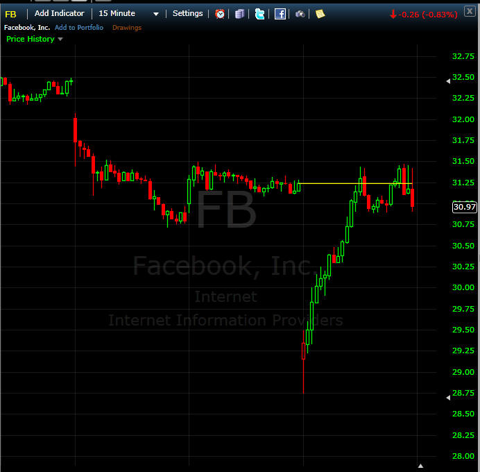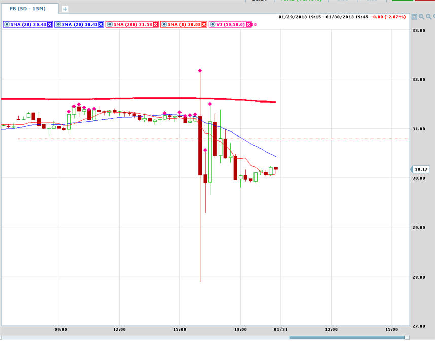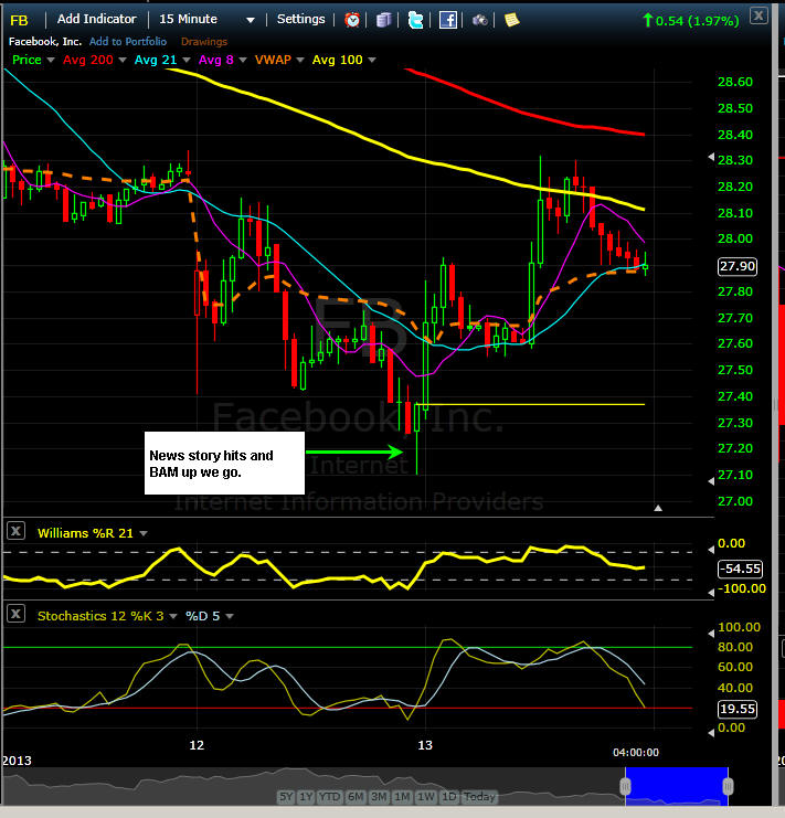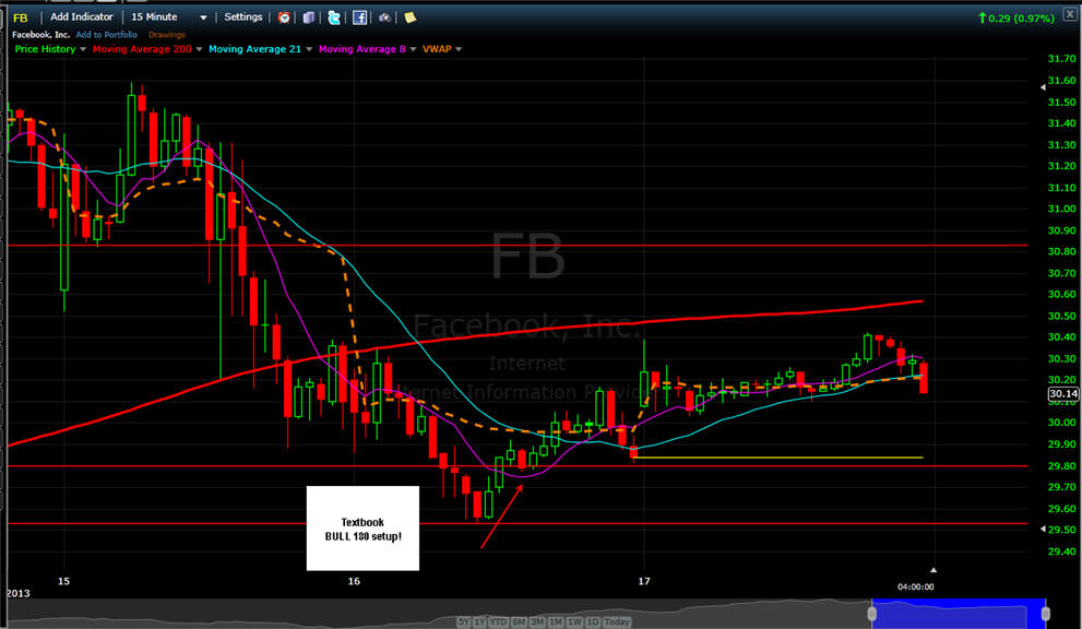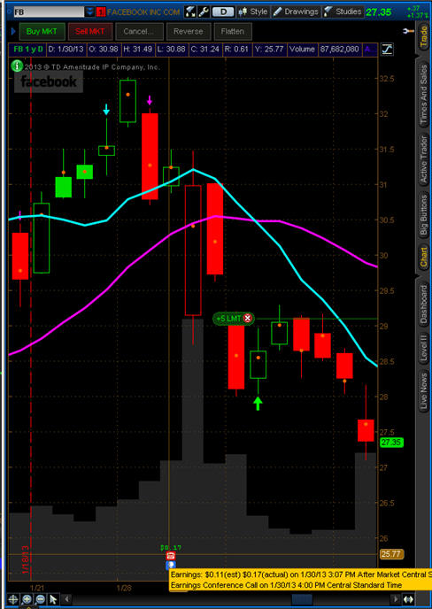 ================================================================================================== 1/17/13 - The past few days of selling are due to a pathetic announcement about some new "search" capabilities, and it has put a bit of a scare or doubt into the minds of investors wondering if FB will beat earnings. Well, if they do not beat, in a big way, this is a 100% SHORT; and if they do beat, I still think it's going to be a "sell the news" event, but a very good long-term investment. The only thing, in my mind, to launch the stock higher in the short-term would be an unexpected announcement like they are buying NFLX or?? Still, this is a long-term buy and hold stock, but if you want to speculate, then you really need to buy more time or be able to sit on your computer and scalp it. There are plenty of trades to be made and yesterday I caught a textbook Bull 180 play on the 15 minute chart and made some nice profits!! I also sold my calls yesterday and will be looking for my next trade ahead of earnings in two weeks on the 30th. I am hoping for a pull back to $27.50-$28.00 area and will buy some more shares, but if FB takes off next week, then I will get long over $30.00. You definitely want to get some OTM FEB puts the day of earnings to protect any long shares you have. Some day in the future this stock has the potential to trade as high as GOOG and AAPL, so you should just start investing in shares and hold onto them for years to come. For now, since FB has pulled back, I am picking up Calls on Tuesday because they are cheap!