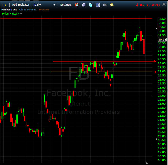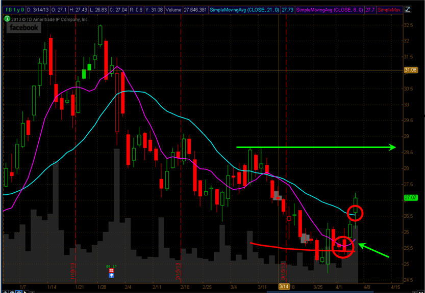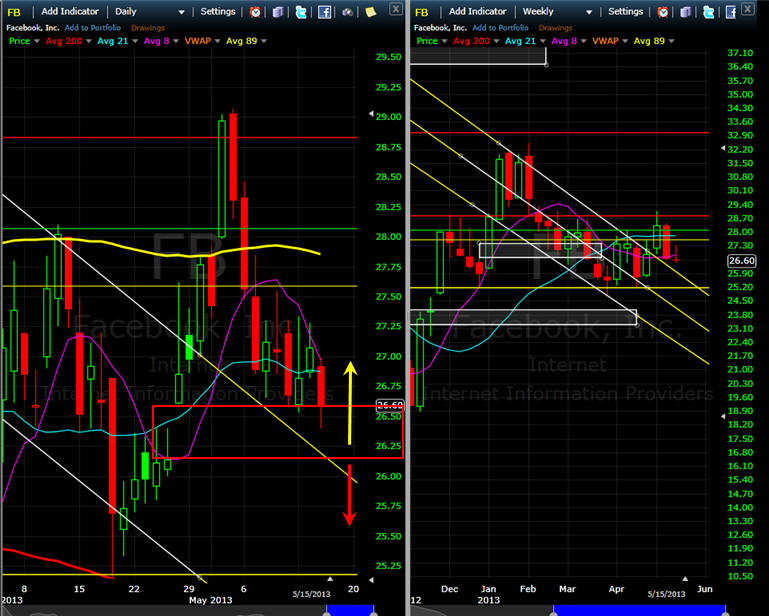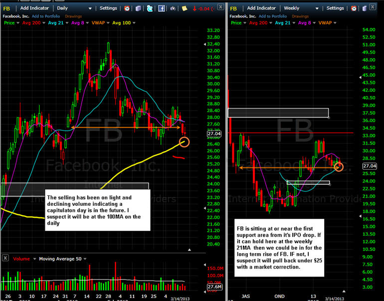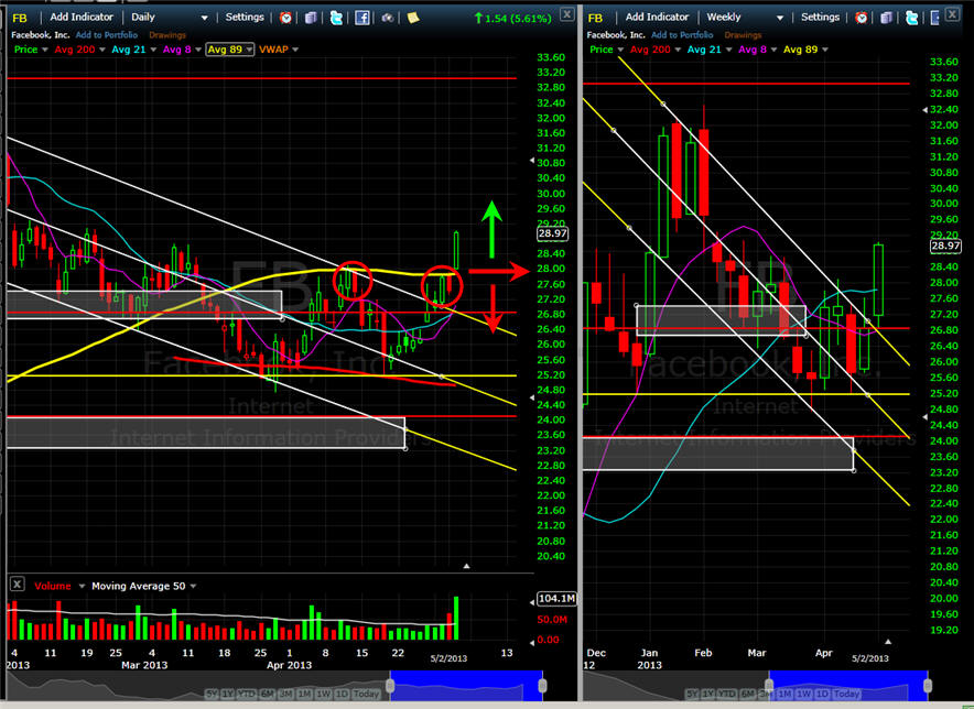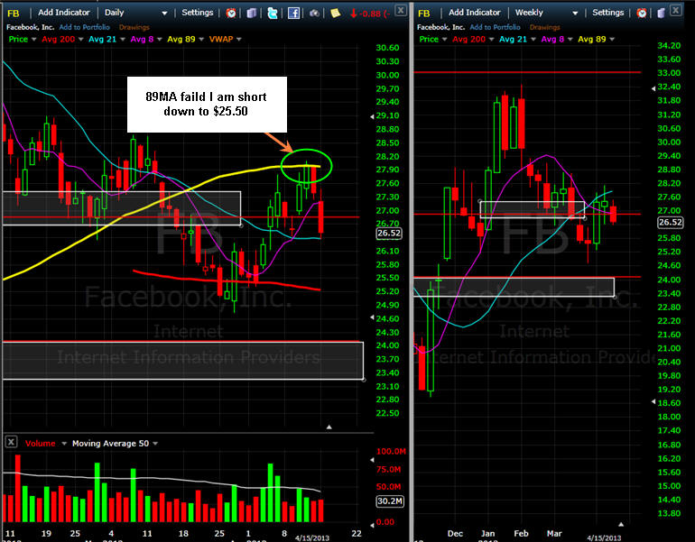=========================================================================================== 5/3/13 - No follow through on a market wide rally. I was profit stopped out of my calls and now I am flat. I am waiting for a pull back to $27.00 and I will sell some naked puts. When the 8ma and the 89ma merge FB should find support.