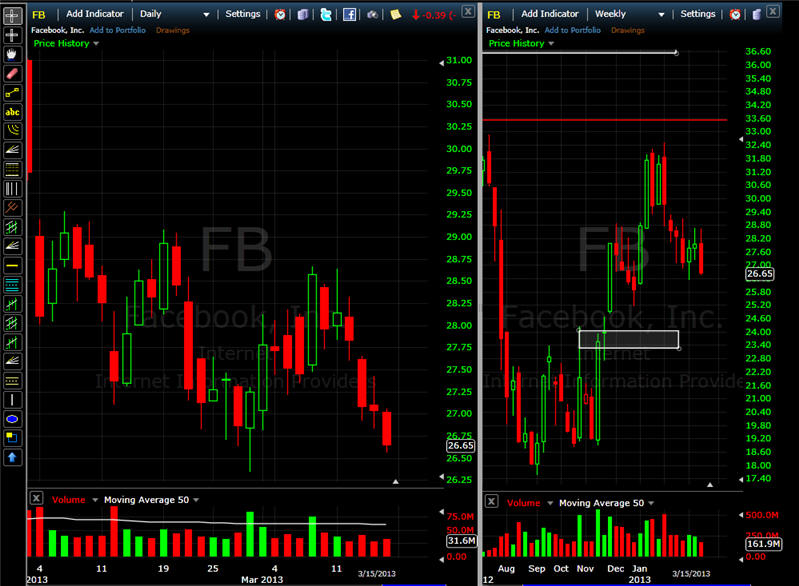 ======================================================================================= 3/14/13 - This week has been a steady decline in the share price of FB and as I suspected it was a short, that turned out to be the case. If you jumped on when I indicated it below then you are making a very nice profit. Tomorrow is March expiration and I suspect there will be some more movement in FB as investors jockey for position heading into April.