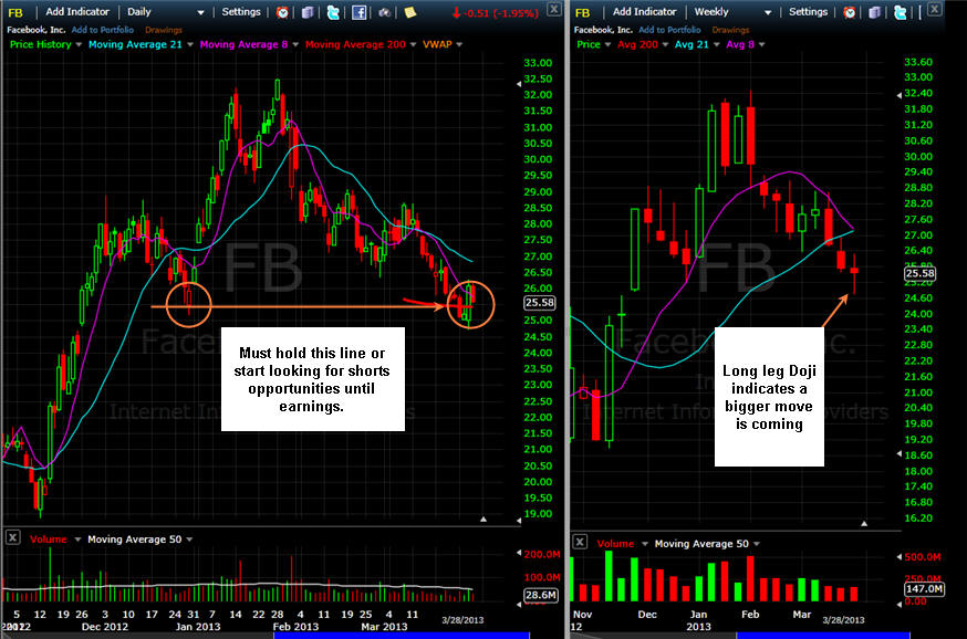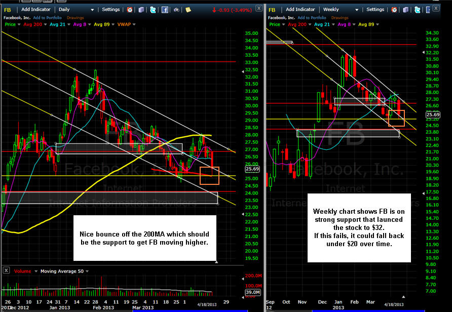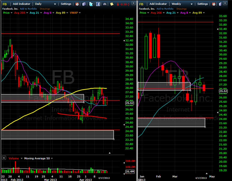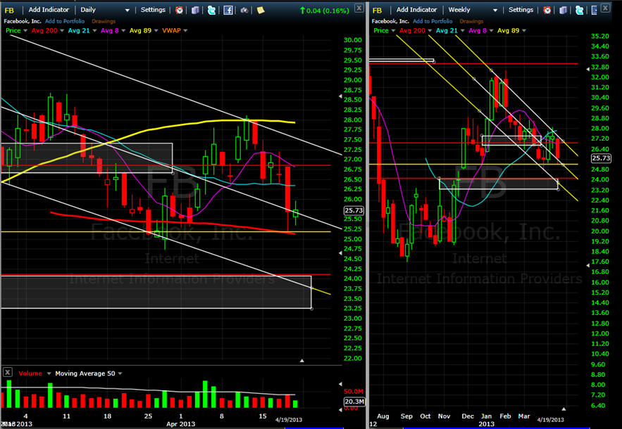 ================================================================================= 4/17/13 - FB is finding some support at the 21MA but it needs to get back over the 8MA to keep the Bull motivated. I need it to get some momentum and pull back to $25.50 by Friday to make my $26 Puts profitable. My $28 puts are almost back to a break even so I am ready to take profits or put in a stop loss at what I paid if they get a move on.