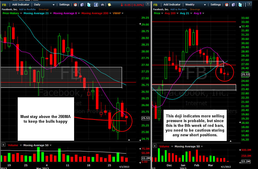 ================================================================================================= 3/28/13 - What a good news story gives, gravity can take away. At least FB managed to hold just above a 55% retracement from yesterday's high and the 200MA on the daily chart. This is a positive sign that yesterdays buyers are still confident they made a good decision. The daily chart suggests FB may have found it's bottom, but the big challenge is the weekly chart completed with another red bar and this one is a long tailed doji. This means a bigger move is on the way; and with the overall markets showing continued resistance to going down, FB might finally rise with the tide. Now if the stock does manage to dive back under the 200MA, then I suspect there will be a power move lower or a capitulation event to clear out all of the sellers and force the shorts to cover.