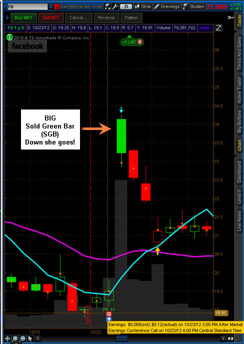 ========================================================================================== 5/29/13 - No green bar today, instead we get a gap down and then a nice slide into my SGB zone on the daily chart. I jumped on a 15 minute Bull 180 this morning and managed a small profit, but that turned into a loss as FB gave up the momentum and resumed its usual trend...DOWN. I was a wee bit frustrated to say the least. I know it's getting close to a capitulation event so I am standing ready to jump back in on a green bar day. I did buy 50 of the MayWk5 23 puts so what I really want to see is a nice gap down again tomorrow and then that capitulation sell off to $20! Oh that would be grand, about $10 grand to be exact! We are now down 18 days from the Bear 180 reversal so it may just take a full 21 before FB finds a support rally and attempts to get back to the 200MA.