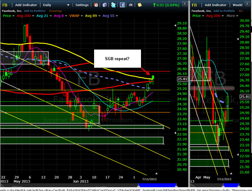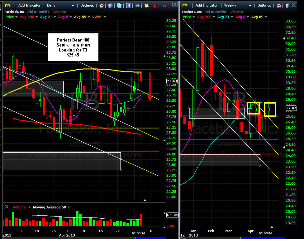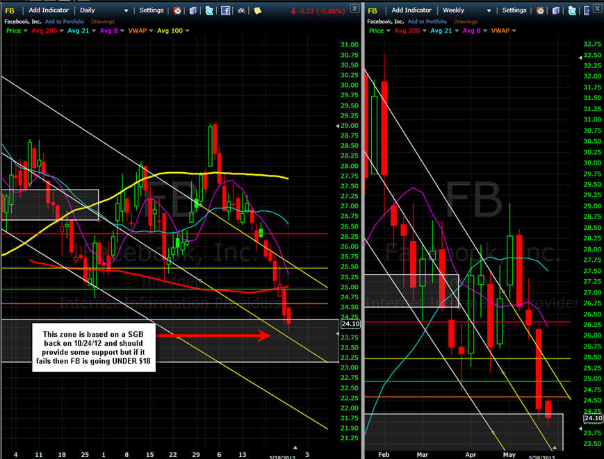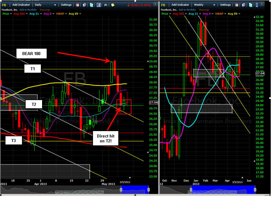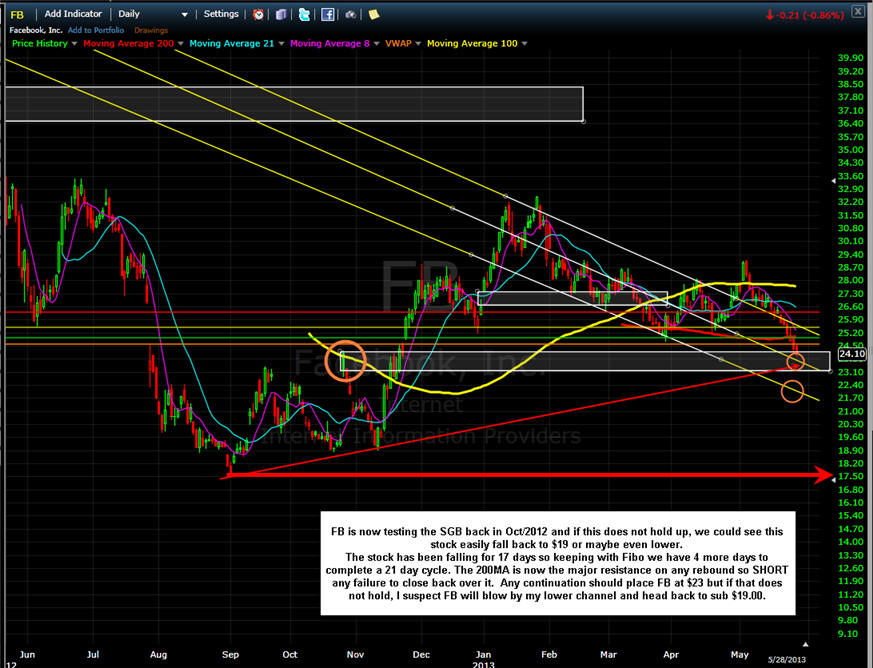 ========================================================================================= 5/15/13 - FB is getting close to the Bear 180 T3 and so any green bar on the daily chart and I am long again. So far, it's holding ground at the lower SGB so if it can stay above it, there is a good chance it will make the journey back to $30. Any long positions started will have a strict stop at the bottom of the SGB $25.70