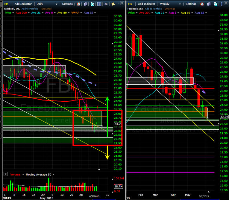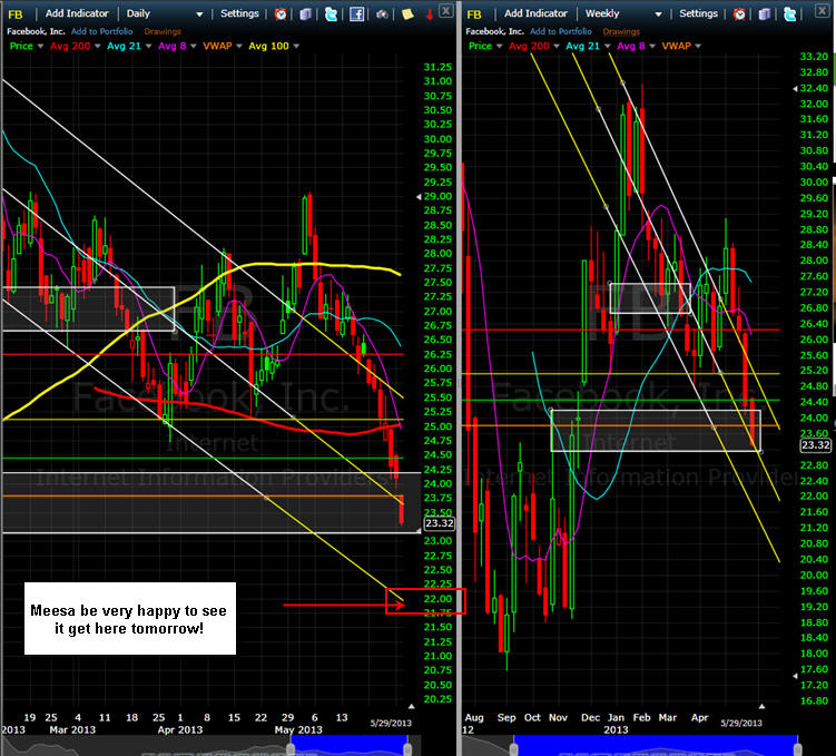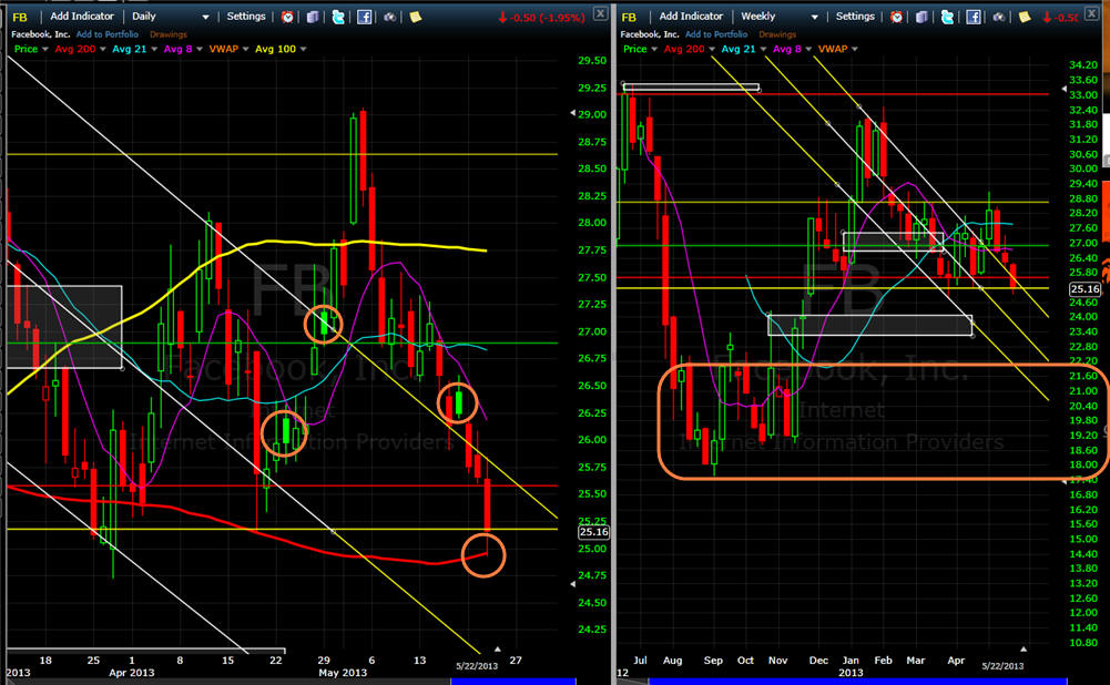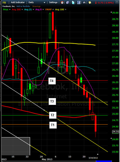 ===================================================================================== 5/22/13 - Touch down on the 200MA and this could be the beginning of the melt-down or melt-up. I bought some protective puts ($24.50) yesterday and good thing I did because it's looking like FB will indeed move back to $20 if the 200 MA is taken out. FB blew right by T3 and that makes me nervous with my Jun $28 naked puts being ITM. If my puts make me enough money to break even this trade, I will buy them back and sell a lower strike price to re-collect the premium I was shooting for. As for my long shares, I plan on holding them for the long haul.