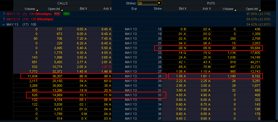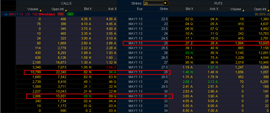 =========================================================================== 4/16/13 - No new plays today, just looking for my 28 puts to make some profits but so far, it's not looking too good. ================================================================================== 4/15/13 - I jumped on more puts today and will look to take profits by Wed as I think this is a short term pull back.