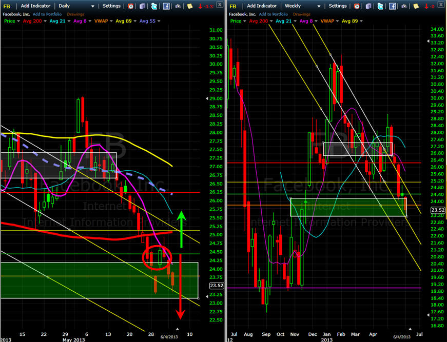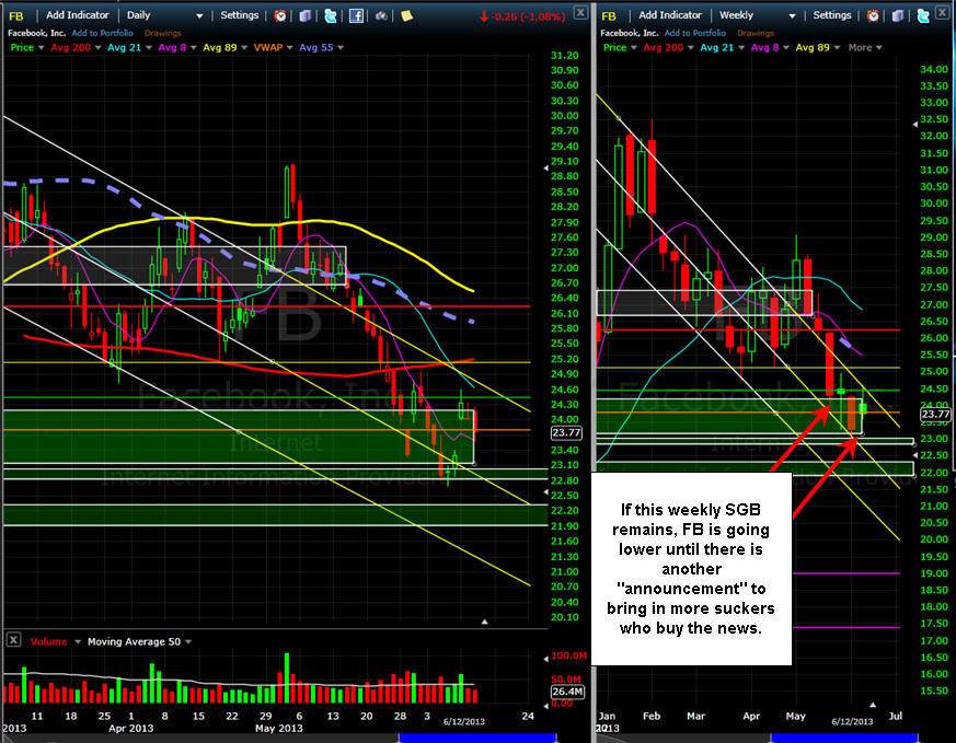 =================================================================================================== 6/12/13 - All the euphoria is wearing off and FB is resuming its current trajectory...DOWN. The weekly chart is now an SGB, and if that remains, then I expect FB to move lower filling the recent gap and testing the bottom SGB range.