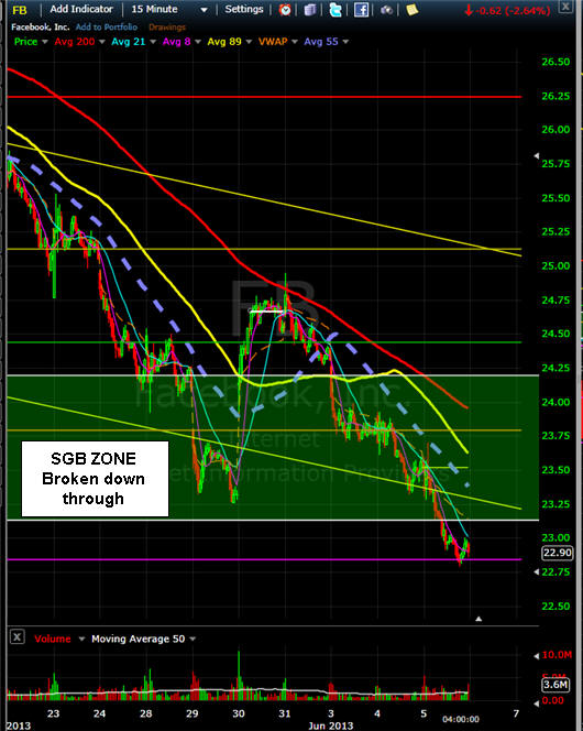 ==================================================================================================== 6/9/13 - Are we there yet? The bottom that is. Can FB find its base and begging the climb back up to the top of the mountain? Well, it will take a substantial amount of positive news to get this massive selling to stop. Typically, when selling has exhausted, it usually happen on very large volume with long bars and then wicks on the bottom of sideways action; however, FB is a new stock so there is not that much data to correlate to. As long as FB is inside all three of these SGB ranges, the stock is more likely to head lower until the next earnings release. I am pretty invested on the long side so I will not be involved in any more until FB gets back over $24.50.
