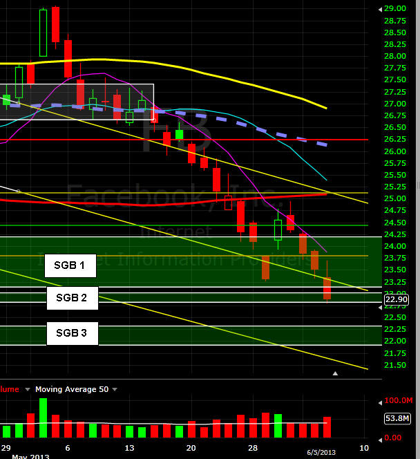 ========================================================================================= 6/3/13 - FB finished the last week of trading in May with a very long-wicked SGB. The next move is going to be? The SGB is proven to be DOWN and with so much selling (dumping) in this stock, it will be very hard to prove otherwise. If FB does manage to make the trek higher, it will have to get over the 200MA and stay over it. I have primarily stuck my neck out on the long side as I am a long-term hoper the stock will some day make the grade with institutional investors and become a $100 plus winner. I plan on trading around these price levels with puts since I have plenty of long positions.