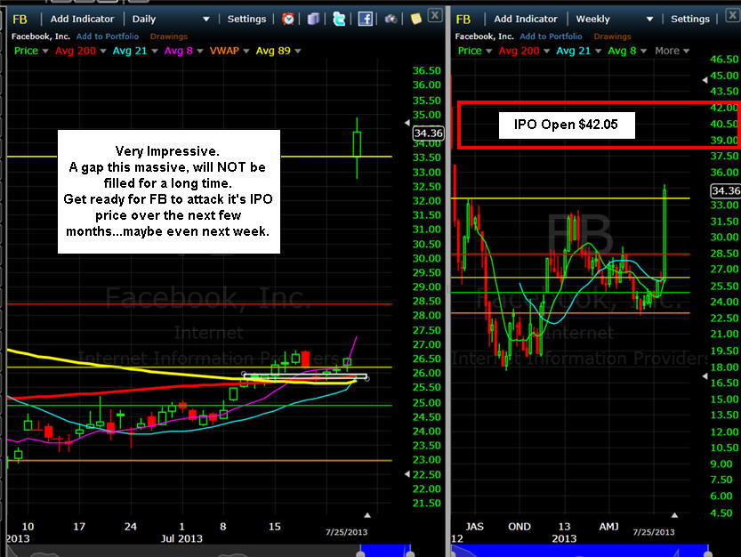 ====================================================================================== 7/24/13 - FB SURPRISED and stock explodes up 20%!!!!!! WOW my Lotto plays are looking pretty strong right now. Tomorrow we stand a very good chance to catch a White Whale too!