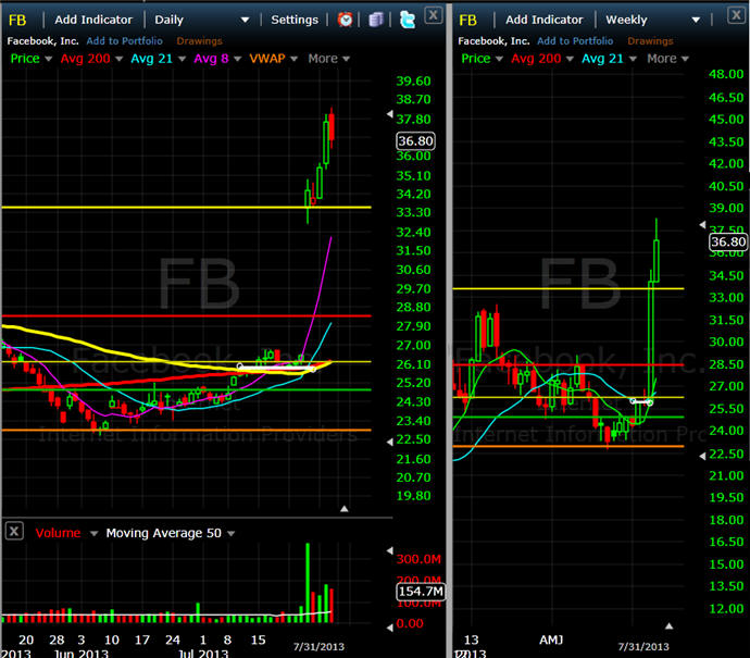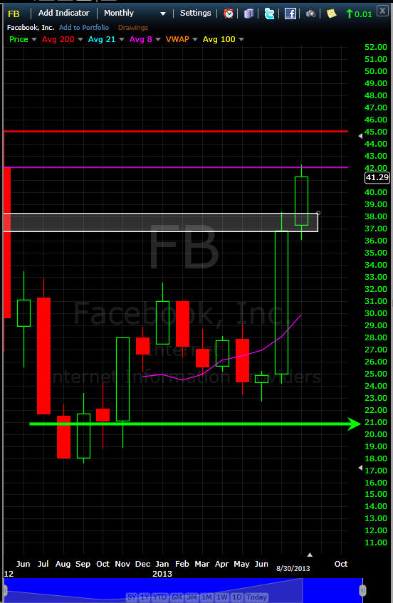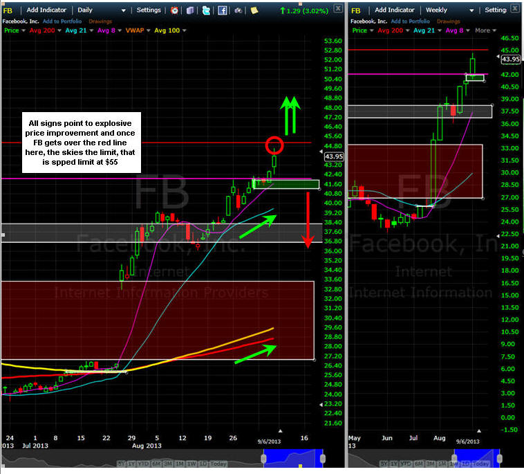 / =========================================================================================================== 8/8/13 - FB has been edging higher testing the waters of it's IPO price and so far, it's holding ground. I think this stock has finally made the turn in the minds of institutional investors and every day it holds above the IPO price, pressure is building for the next POP and ROCK higher. This is a long term stock investment but very susceptible to wide price moves back down if any bad news hits so be willing to take the ride both ways. I am going to start selling some Naked Puts and speculate on OTM calls because if this stock takes off again, the next move should be at least 55% of the last two weeks Bull explosion! ==================================================================================================================== 7/31/13 - FINALLY! FB surpasses its original IPO price and now all the talking heads are saying BUY BUY BUY...lol...what a bunch of moronic followers they are. No one is willing to really put their ass on the line before the action happens, but they all want to taught how brilliant they are after the fact. If you were following my trade ideas on FB then you are VERY HAPPY right about now as I am ahead of the curve as usual! Ok, so is this the beginning of the next GOOG or what? Well, I will have to wait until I see FB trading at $100 before I can confirm that...lol Seriously, I think FB has the potential to climb the ladder of share price and beyond but I am not a FB junkie, I do not even like using the site myself, but a billion plus people do and that translates into BIG BUCKS as they improve and grow their service. The newest rumor is they will be added to the S&P 500 in the near future and when that happens, this stock is on it's way to $50 in no time. Question for you is, can you make the long term investment and go through the price swings? I say YES YOU CAN and should start accumulating a position in this stock as a very long term buy and hold. I plan to sell naked puts so I can get paid to own it and I will continue to speculate on call strategies because this stock has now shifted bias in the minds of institutional investors and once they start the buying, UP UP UP is all FB is going to do. The best way to get into this stock is buy some shares now, then place orders 8% under and sell some Jan 14 Naked Puts 10% under. If FB only pulls back to the post earnings pop then I plan to get more aggressive.