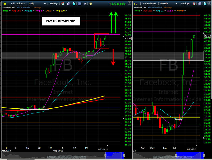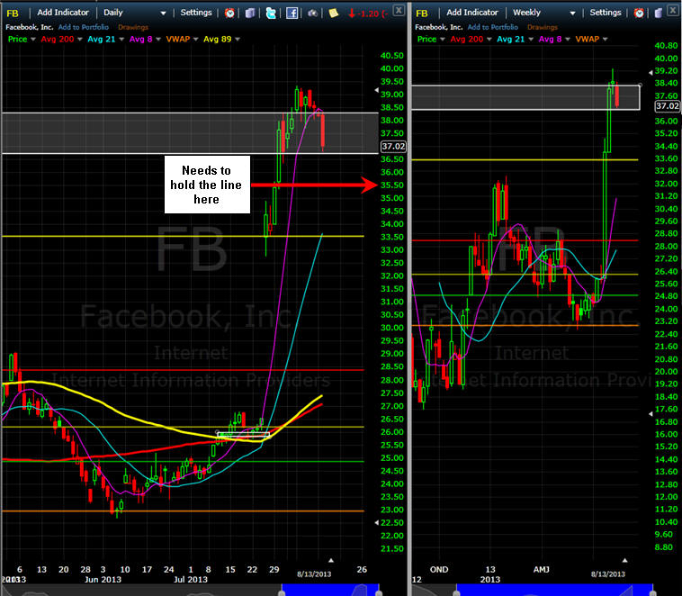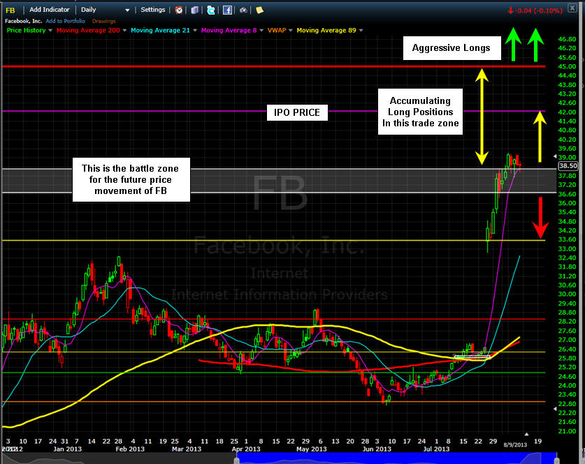 --------------------------------------------------------------------------------------------------------------------------------------------------------------------------------------------------- 8/11/13 - FB has been quiet for the past week but volume has been strong indicating accumulation. Volume on Sep and Oct calls has been strong with the bulk of the open interest at $40 which will prove to be strong resistance. If FB does get over their intraday IPO high, I suspect there are BIG orders waiting there and FB will see a short term rise over $45.00. Any dips back under my battle zone will be bought by bargain hunters thinking FB has turned the corner, so if FB pulls back this week, then I would expect a bounce that MUST hold.