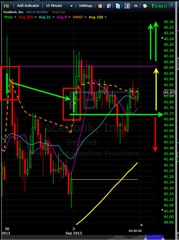 ======================================================================================= 4/1/13 - As we start the first trading day of Q2 FB took the day off closing basically flat on the day. The 15 minute chart has some interesting patterns in it indicating FB wants to go lower, but we know this stock can and will move higher on any "newsy" story. That is why I am more interested in selling premium for now vs. putting direct capital into a trade direction. I am still waiting to add more NP positions.
