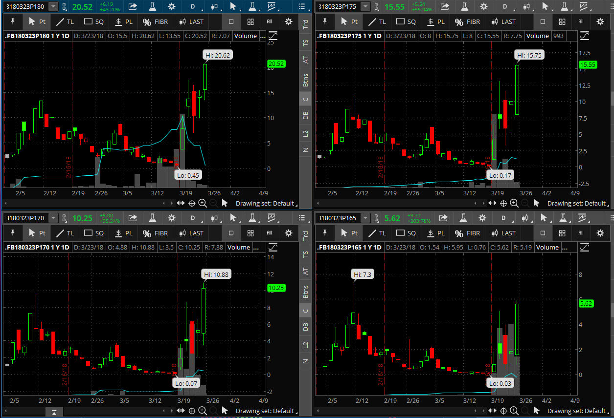 ================================================================================ 3/23/18 - The selling resumed Thursday and accelerated on Friday into the close. WOW what a Lotto White Whale Trade these strikes became. We may have missed out on this one, but there will BE ANOTHER ONE COMING so you just have to pick your stock(s) and keep laying the nets. There will be a lot of losing trades along the way, but as you can see below, once you hook onto one, it pays off ALL the losers and advances your trading account. The KEY is to aggregate your profits over a years efforts and ONLY increase contract size AFTER you have winners, that way, you will COMPOUND your profits faster and faster with the goal of reaching 100 contract loads and collecting retirement account profits!!!!!!!!!!!!!! If FB loses members by the millions, then the stock could easily get cut in half so I am keeping my finger on the PUT trigger up to 15% OTM if there is a dead-cat-bounce this week. The key is watching the retracement action at 55% of the last two weeks selling—fails aggressive shorts, climbs higher moderate longs and bull put spreads. Either way, this stock has a lot of PR work to do and a massive amount of profits to be protected from long term investors. There are no doubt plenty of dip buyers hanging around at the weekly major moving averages like the 89 / 100 / 200. Now that FB has failed the 200MA on the daily and crashed right through the old topping SGB zone back on 7/27/17, the bias is to the SHORT side until the stock can get back over this zone at $175.55 =========================================================================================================================================== 3/22/18 - FB is catching heat from news about Cambridge Analytica data being leaked, collected and used to help the Trump campaign? Really? So now CEO Mark Zuckerberg comes out to defend his company, their motives and desire to make necessary changes to assure user data cannot be used in a manner that violates the privacy, trust and needs of their users. https://finance.yahoo.com/news/zuckerberg-press-event-shell-195954860.html When this news hit the wires, it caused a HUGE drop in FB shares; and if you were fishing for Lotto Puts on Friday; then you made some BANK the following Tuesday! I for one bought some puts for last week (expired worthless), and was unable to make it to my computer Friday to buy for this week—DANG!!!!!!!!!!! what a White Whale missed opportunity that was. Well, the lesson I learned here is that I now have to buy the front week, and on Friday's, buy the next week when fishing for Lotto Trades so I can assure I have higher odds of connecting/hooking a massive White Whale like this one turned into. Going forward, this type of news can be very damaging to Facebooks reputation; and if it catches fire in the minds of users; this stock could start a massive slide lower as advertisers fear users are heading for the exits; and if those users like Zuckerbergs apologies; then we could see the usual couple of days downward reaction; and then the stock resumes it's steady rise higher—my strategy is to buy puts up to 10% OTM and fish calls up to 5% OTM going forward. Below is an example of what can be a reality if you stick to a single stock (as your "go to" stock) and just keep laying orders Wed-Fri and now buy on Friday at the close so you can potentially wake up to a massive Lotto Trade on Monday's. I am adding expiration Friday buys for the next week with smaller contract loads; and will work on building my profits so I can expand this into more stocks week-to-week—it's like adding a bigger net to catch more than one White Whale in the future.