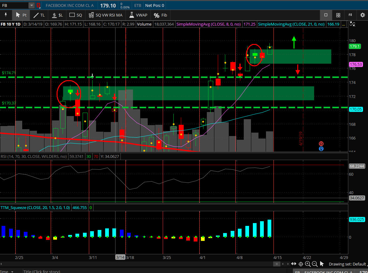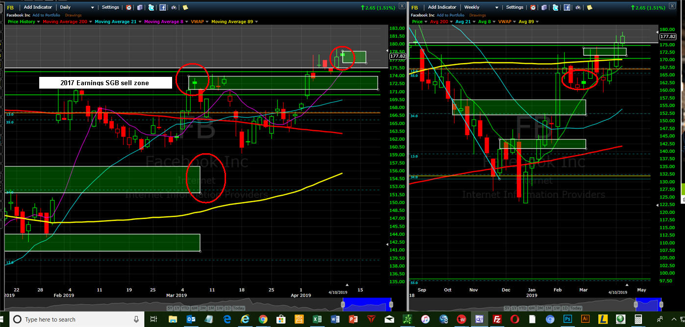 ==================================================================================================== 4/14/19 - A continuation move from the long time SGB zone breakout has FB giving us another SGB on Wednesday. The trend is still UP as the stock works its way back up; however, it has a ways to go before it can reach the all time highs at $218.00. With continued SGB's kicking in we have to keep some PUTS in play at those SGB zones and go with momentum. There should be some continued higher ground as FB heads into earnings on the 24th but news can shift sentiment at anytime.