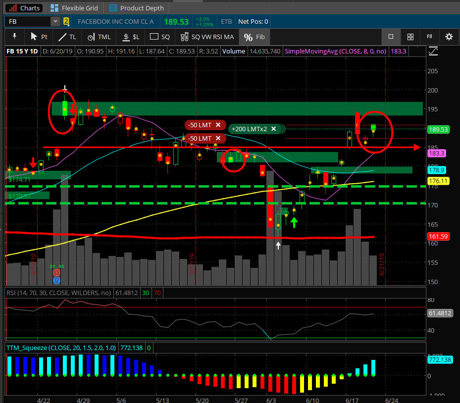FB is still under scrutiny over its crypto currency and news from Morgan Stanley CEO (old school guy...millennial's are more interested in "new money" ) basically dismissing the concept; however, BITCOIN rallied quite a bit since this FB news announcement, so there is still some speculators making bullish bets on the social media giant. There was also an upgraded from Deutsche Bank with a price target of $230. With SGB's in play, I am leery of "upgrades" so my bias is still BEARISH on FB until takes out the $192 level.