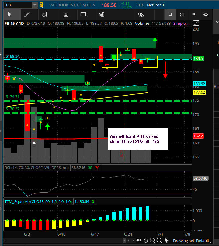 As for post earnings trades this week, you could look at fishing the 180 PUTS for a WW Trade at the open; because if this is a pump-n-dump in after hours, this stock could get crushed back under the SGB zone at 175. But, if the smart money has a one-and-done mentality on that upcoming astronomical fine, then FB is on its way to filling the last BIG earnings gap down from 7/2018 and heading back to its all time high of $218.62.