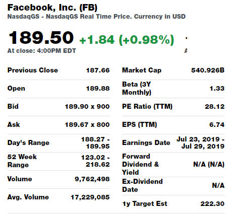4/24/19 - FB reports a strong quarter and investors jam the stock higher nearly 10% in post trading. Question is will it hold since they revealed they priced in a massive (potential) fine from the FTC of $3b - $5B over the privacy issues last year. This is no slap on the wrist, and could create an avalanche as more information continues to roll out. Right now their user base is still enamored with them, but if that sentiment shifts as people wake up, they could suffer a mass exodus and that would plummet the stock as it holds valuation based on eyeballs.