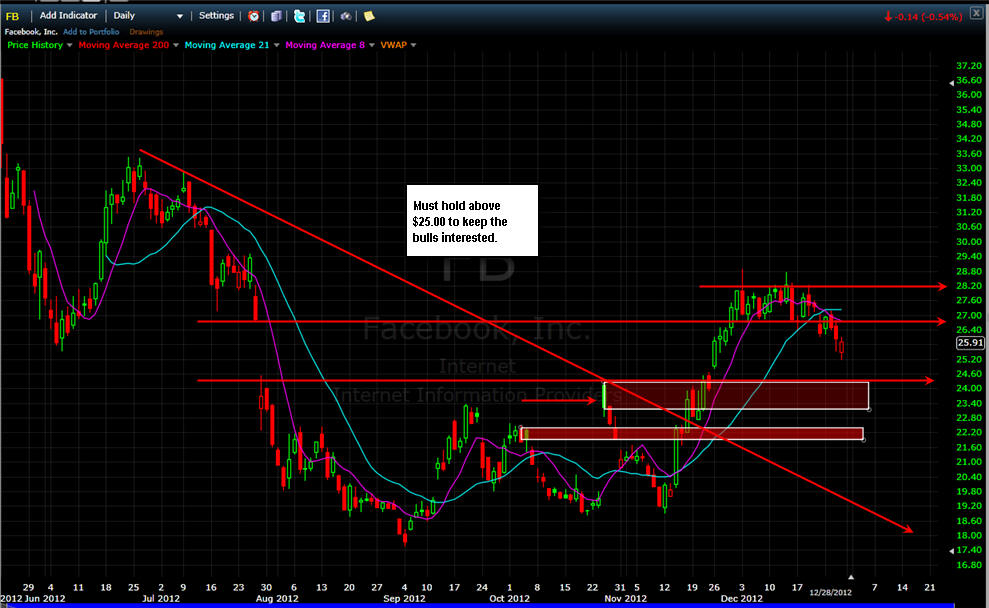 =========================================================================================== 12/28/12 - FB is losing a lot of its positive momentum as we head into the final day of trading for 2012. With the fall off the Fiscal Cliff almost a lock, there could be even more selling on Monday, but if we get that expected (hopeful) rally deal, then short covering will be massive and FB will no doubt make a very strong move higher. The next earnings released is scheduled for 1/23/12 and this particular one will be an important benchmark for the company with regards to the future of their stock price. If the company surprises, then the race is definitely on for the IPO highs; however, if they disappoint, then you can and will see this stock fall and stay down for months. So, you just have to play a straddle and hope for a big move in either direction on the short term. As I have said in the past, FB is more of very long term investment you buy and just forget about for 5+ years. For the short-term trader, FB gives us some pretty good volatility to make some profits with. Looking over the chart, I want to see this stock get back over $27 by expiration so I can must collect the premium on my Naked Puts but if I end up getting assigned the stock then I will just sell covered calls for Feb and I will have some puts over earnings just in case they get crushed.