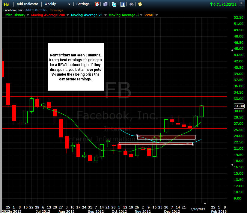 ================================================================================================= 1/3/2013 - A couple of days of euphoria is wearing off fast and FB is showing signs of topping out for the third time. There were a couple of upgrades and buy ratings, but that may be the sucker punch offer while the big holders of the shares dump to the uninformed traders. I am always leery of upgrades especially when stocks are popular and trading at failed highs. There is still a ridiculous amount of optimism in this stock, so any short traders are always going be ready to cover and that makes for a lot of volatility. I know I have tried several times to trade this stock, and to date, I am not profitable with it yet, so I am eager to find a couple of lotto trades to take care of that for me and this earnings season will be one of the best opportunities to make a ton of money for 2013!—I will be looking for my next trade opportunity as we get close so stay tuned.