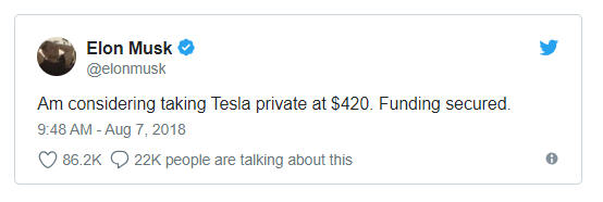 8/12/18 Really BIG news this week was a tweet from TSLA CEO Elon Musk saying he plans to take his company private at $420 per share.