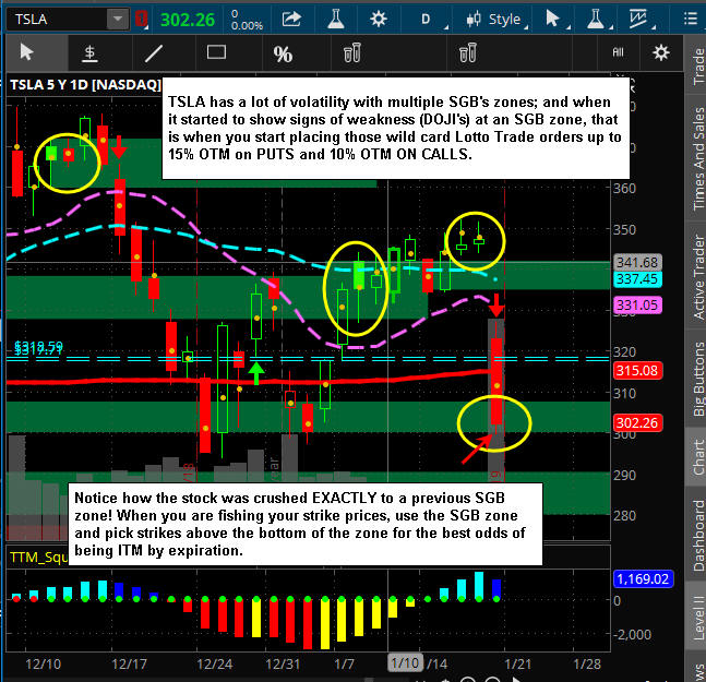When you are hunting for your Moby Dick's you want to pay very close attention to the SGB zones because they are proven to be the KEYS to the profits kingdom so you want to target your strikes you buy there. The best thing to do is get strikes just above the bottom of the zones for PUTS and just under the top of zones for CALLS.