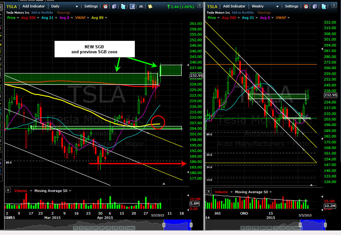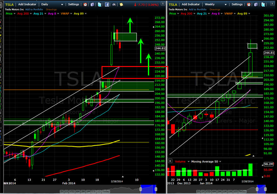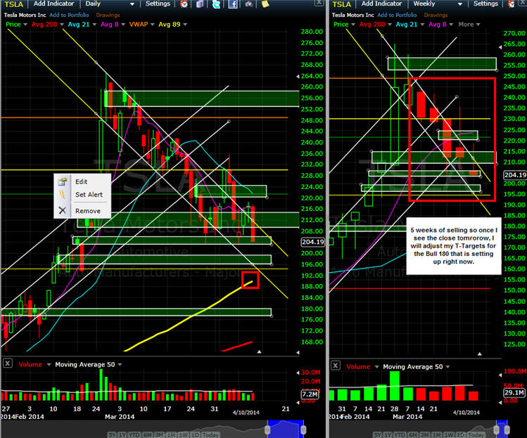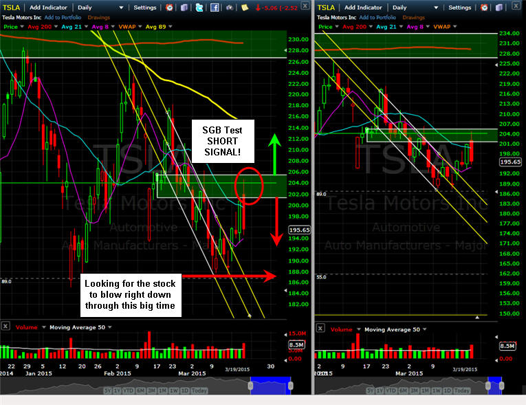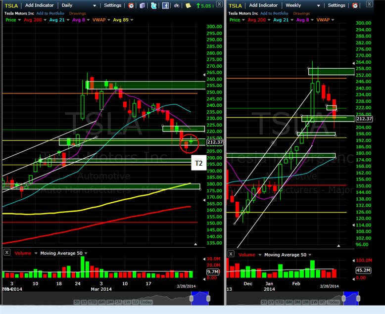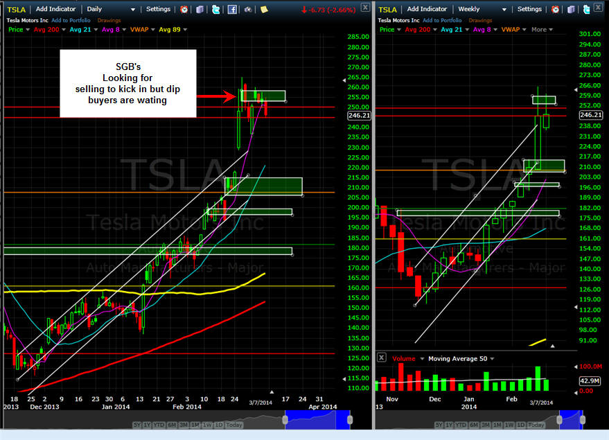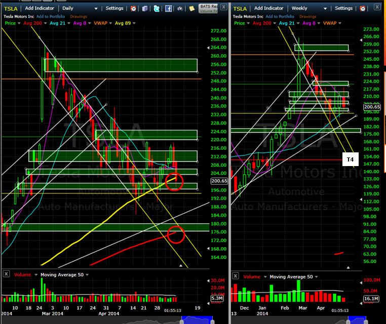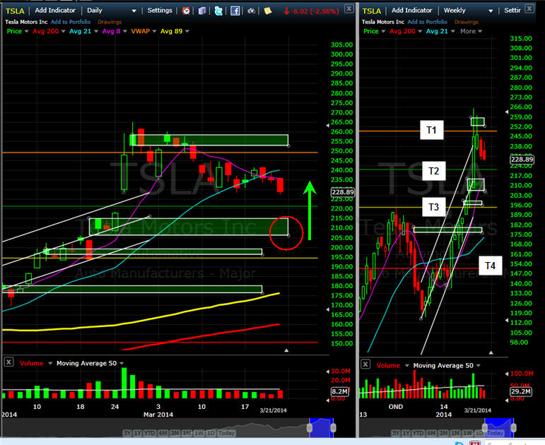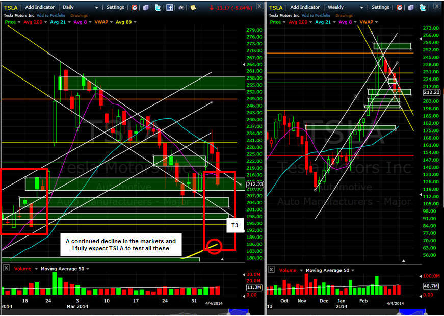 ======================================================================================================= 4/6/14 - Entering the SGB zones and with continued selling in the broad markets we should see TSLA test under $200, so any possible attempt at a retracement back to the SGB at $222 - $225 and I get some aggressive shorts on.