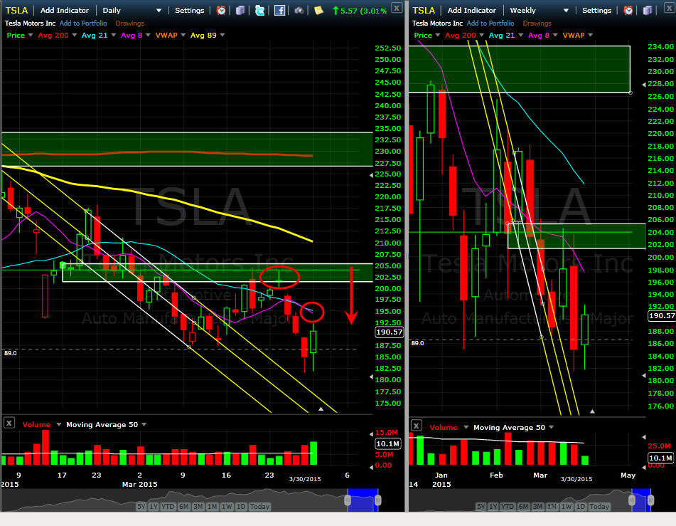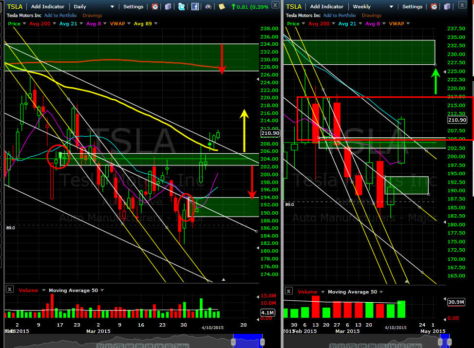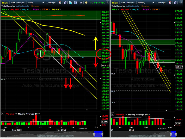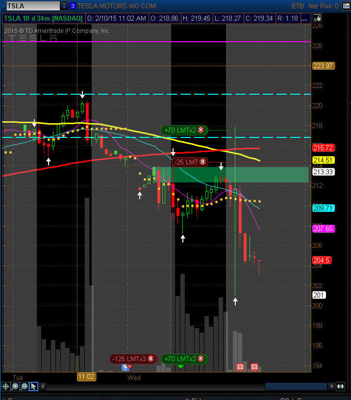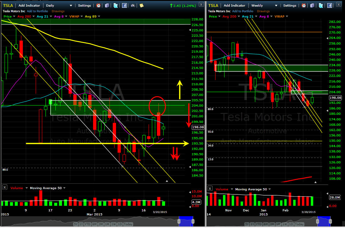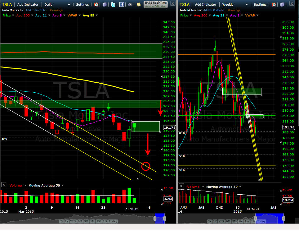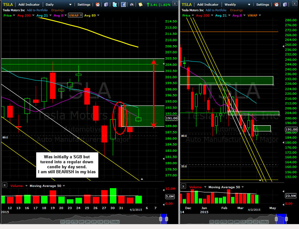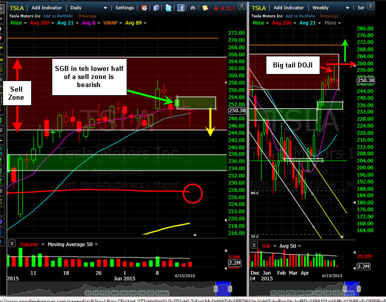 ======================================================================================================= 4/6/14 - Entering the SGB zones and with continued selling in the broad markets we should see TSLA test under $200, so any possible attempt at a retracement back to the SGB at $222 - $225 and I get some aggressive shorts on.