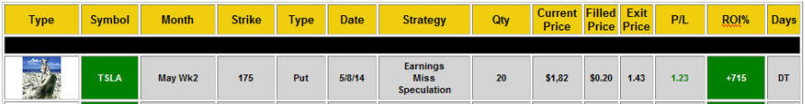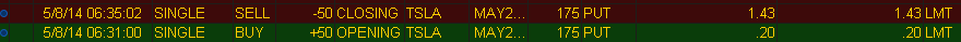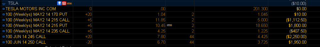 ============================================================================================================ 5/8/14 11:00 PM: Caught another White Whale!! I took profits this morning and by the end of the day, TSLA rolled over and dropped even lower. If you are sill in you may very well pick up some HUGE gains tomorrow. I plan on doing some more fishing in the morning now that TSLA has NO buyer interest after today's reversal. The 170 puts are currently trading at $0.50 so if we do get a continuation tomorrow, I am looking for those to build profits too. The OTM Bull Call Spread will expire worthless as TSLA will never make it above $250. I Sold the Puts on my straddle for a fat profit and I have the calls long, but since TSLA failed to climb higher, those will also expire worthless; however, the puts more than paid for them.