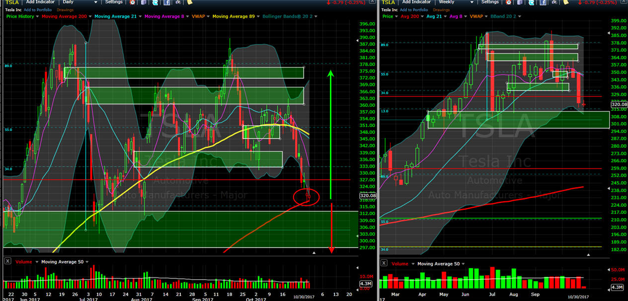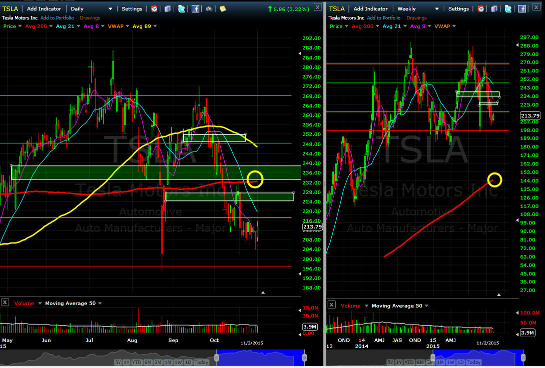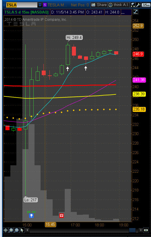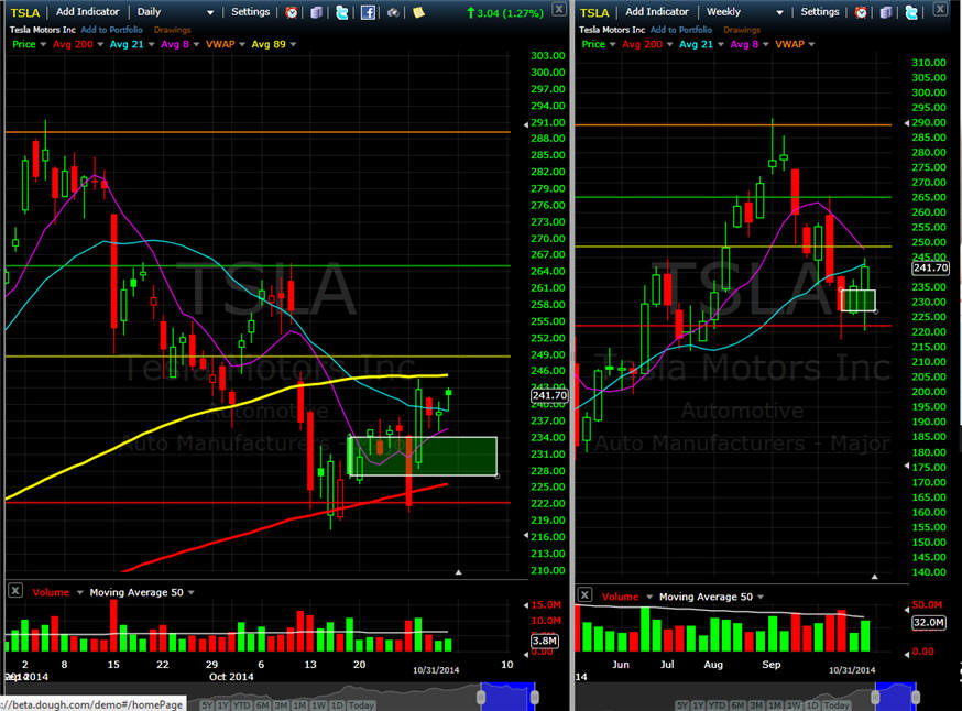 ============================================================================================================= 10/29/14: Earnings are next week on Wednesday and they should be a mover for the stock in light of recent events. I do think some of the steam has been taken out of the shorts sails since the Musk tweet, so it's going to take a big surprise to get this stock moving in a bigger way. Currently the MMM expected move is $20 but that will definitely change in the next couple of days. Aside from any other news prior to earnings, I think the 89MA may have the breaks on for TSLA. If the stock does not make a bigger move higher tomorrow, than it did on Friday, we may just be able to get some cheaper lotto calls/puts on. If they do not surprise, I think the selling will continue so we want to look for longer term puts at earnings.