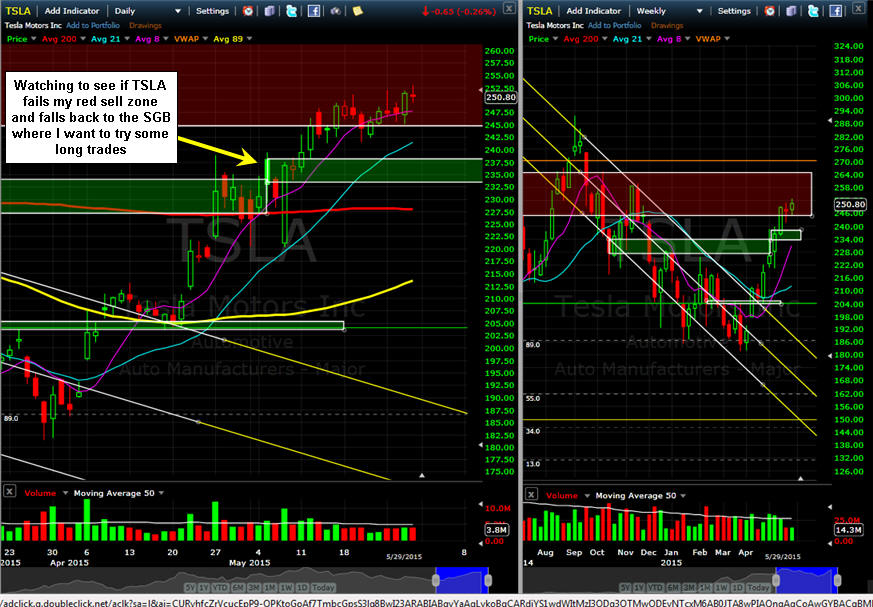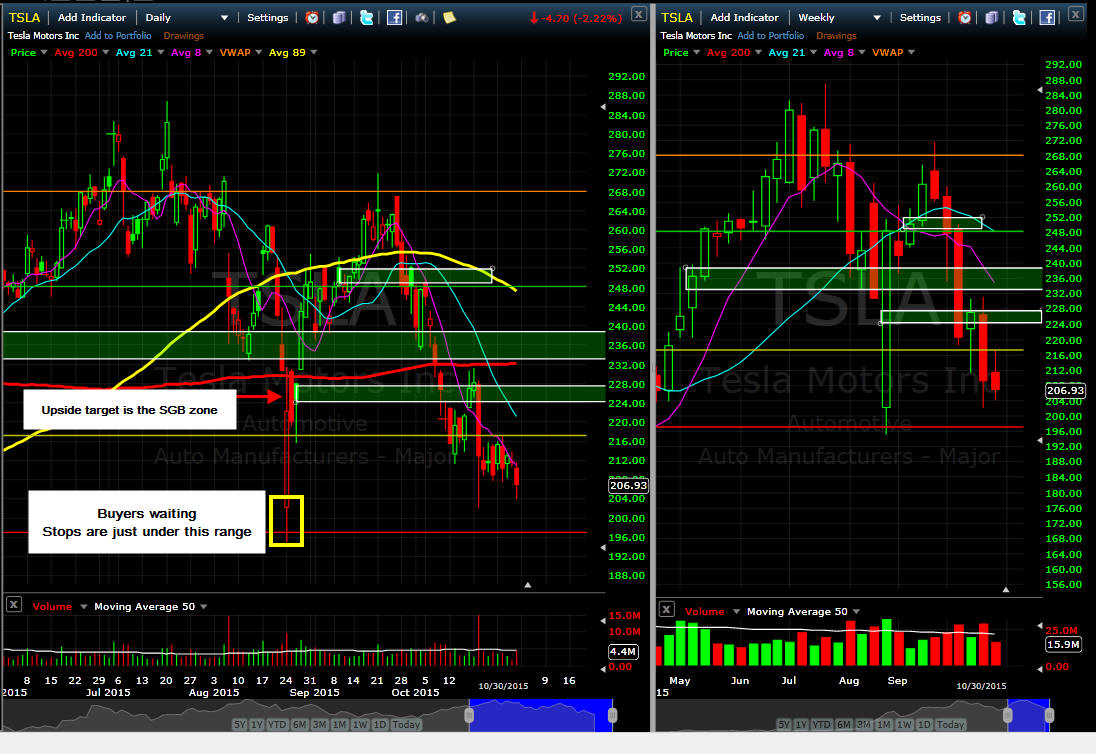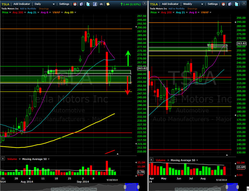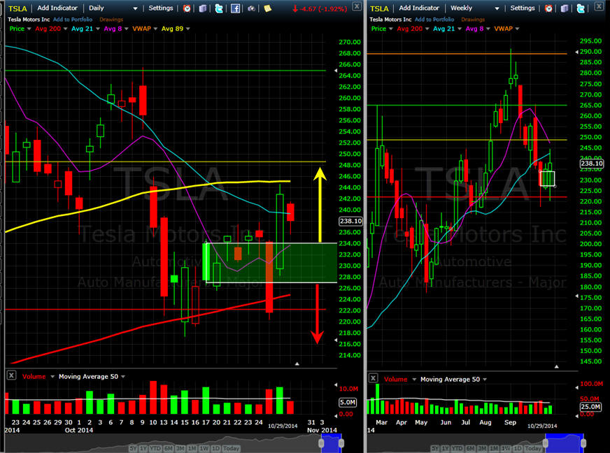 ========================================================================================================== 9/28/14: TSLA is looking ready to take another dip lower, but that is usually the time you want to get long. Well, for me, any move higher is just a better short entry point so until TSLA take out my double SGB zones on the daily chart, my bias will remain bearish.