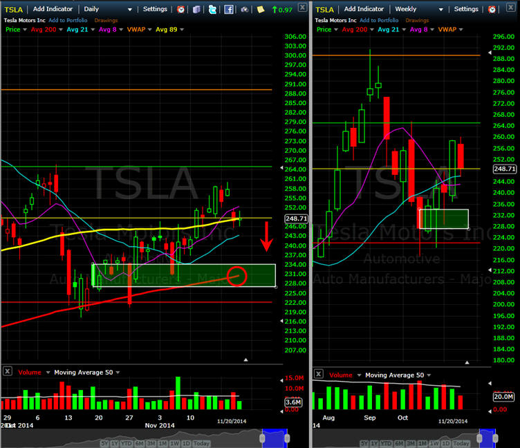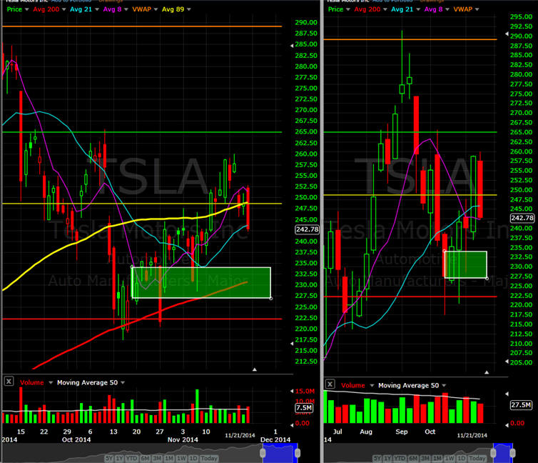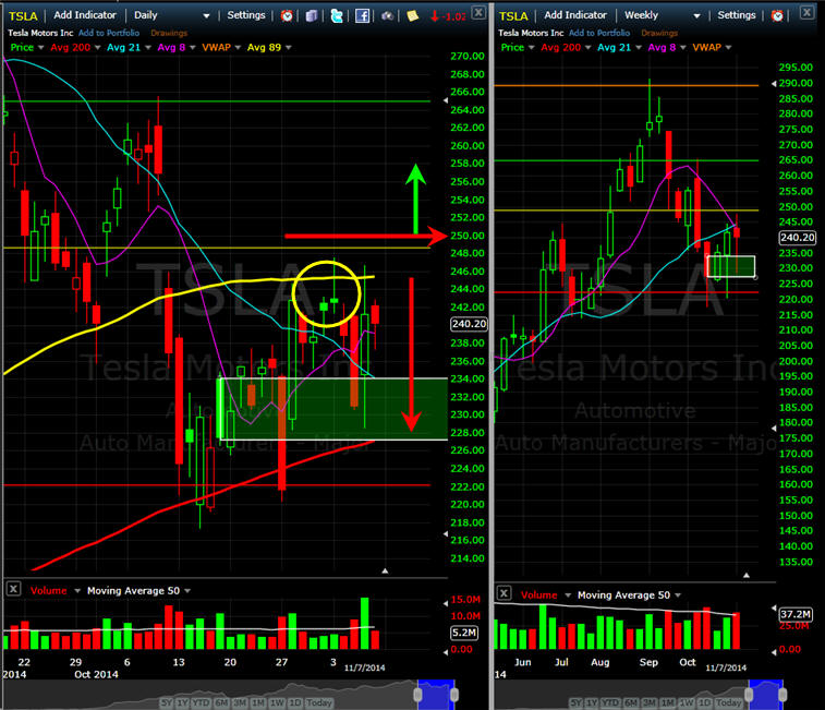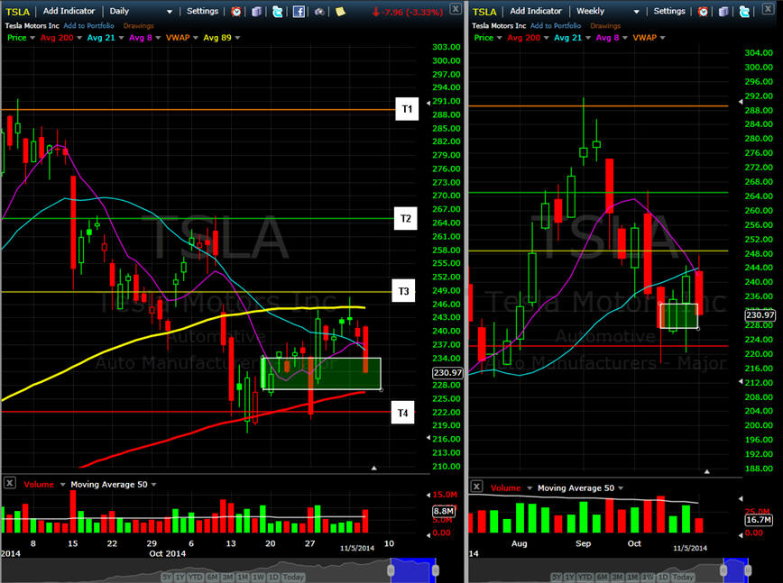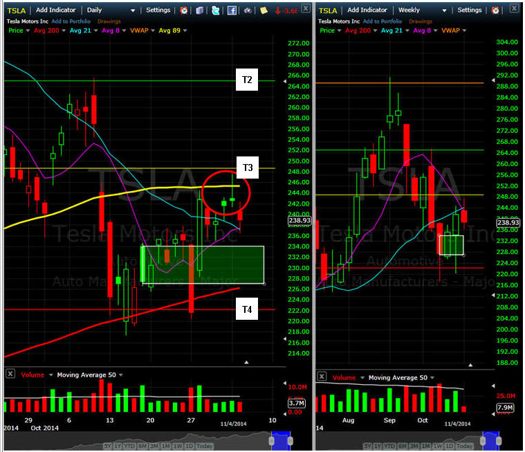 ==================================================================================================================== 11/22/14: The stock was dumped on Friday and the candle is a very bearish engulfing one. Until TSLA takes out the previous weeks Bull Elephant bar, it can still reverse but that is not likely going to be the case. I am flat for now because I have too many positions to manage and keep track of. If you short this stock, stick to my T-Levels for entry and exit points.