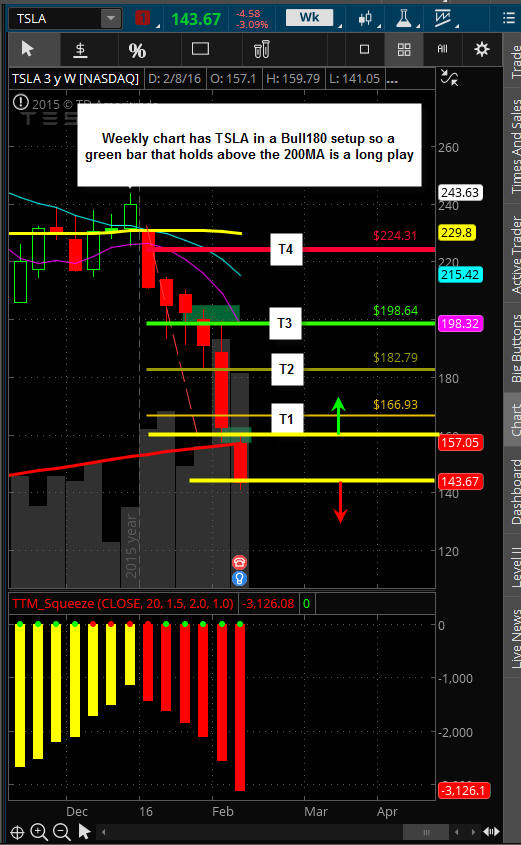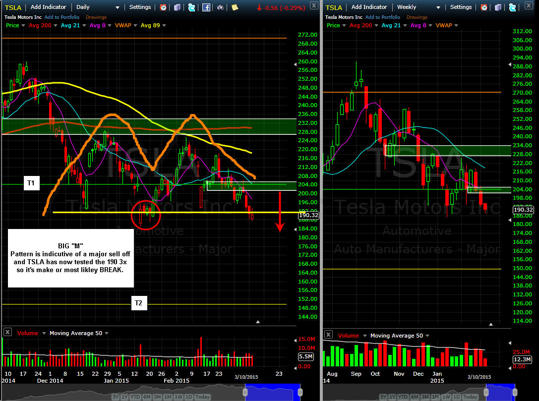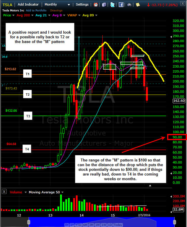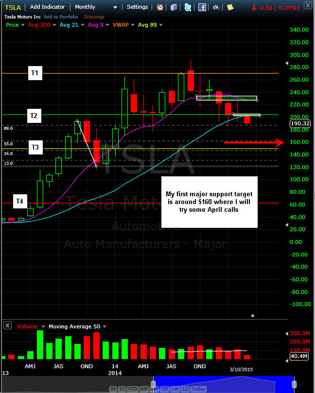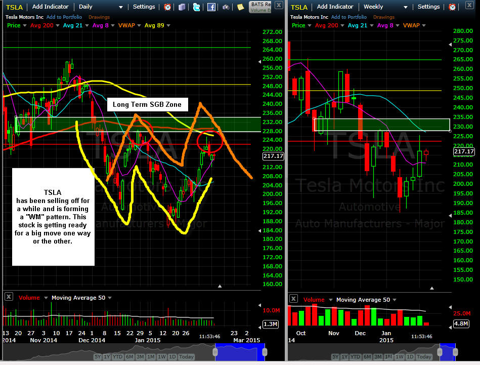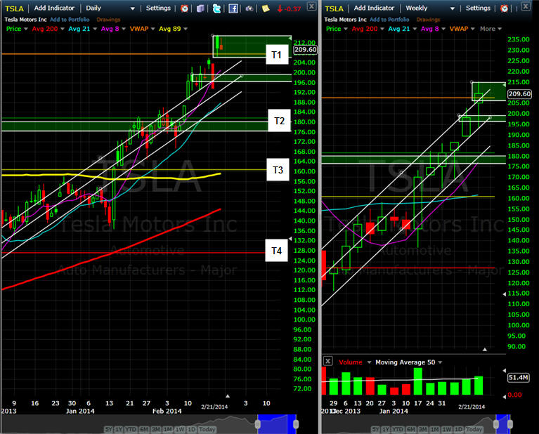 ============================================================================================================== 2/18/14 - It's earnings time and TSLA is on fire despite cars burning to the ground. The love affair investors have for CEO Musk is just the same they had for Jobs...he is the new poster boy for innovation and bringing childhood dreams to reality. Now we have been trading in this stock for a long time and although I have left it alone for a month, I have not forgotten about it; I just wanted to find a great trade and catch a White Whale. Well, we have quite the opportunity in the next couple of days so let's get out our fishing poles and harpoons mates! Ok, the charts have an extremely bullish bias in spite of several failed SGB short signals, BUT, we have the makings of a very large move with a DOUBLE SGB setup on the Daily and confirmed with another SGB on the weekly. Now if the stock meets, or disappoints, I am fully expect a complete breakdown and pull back to my T3 target. I do not expect it to fall all that way in one day (it can happen) but I know it will get there especially if the markets also roll over again. If they beat, which is fully expected, then I expect this stock to rocket beyond $250. The play for me is to bias long and lay put nets for the upset.