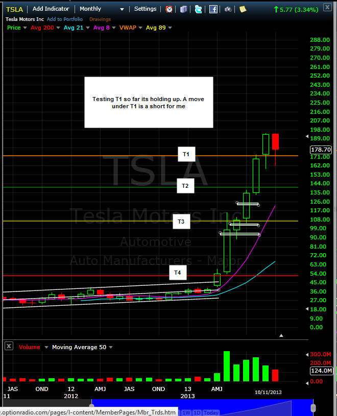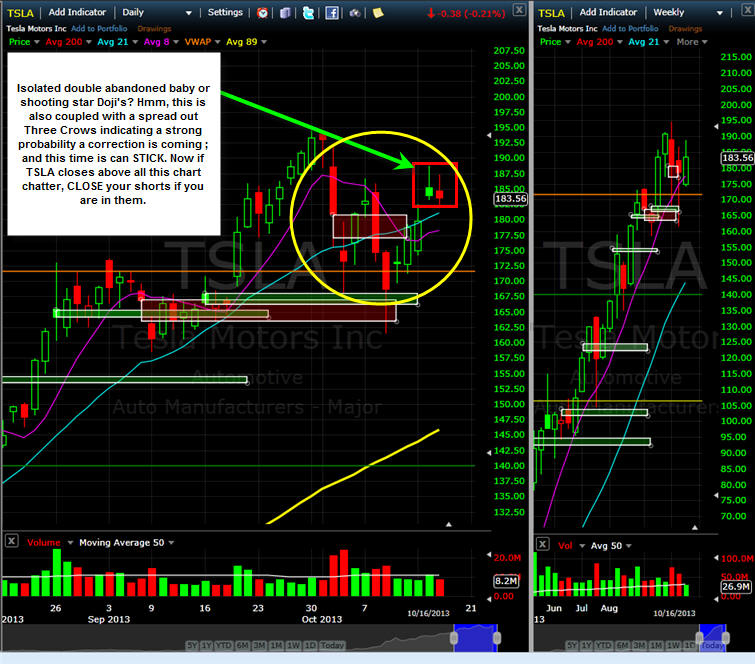 ======================================================================================================= 10/16/13 - Government shut down kicked down the road, DOW rallies 200 points and TSLA closed DOWN? Huh?? Wow, you would of expected this stock to be up at least twice the percent gain of the DOW today. We have a very interesting candle pattern in play and all the signs are pointing to a decline in this stock is about to begin. Of course every time investors have attempted to short this stock, they get whacked, but this time the candle patterns are telling a very strong story for the bears. Just remember, if you short this stock and it does not work out, GET OUT. There will be plenty of opportunities in the future for shorting. I would say you are better off just selling some call spreads for now since TSLA is still well above my T1 target.