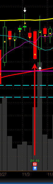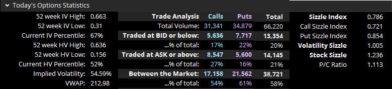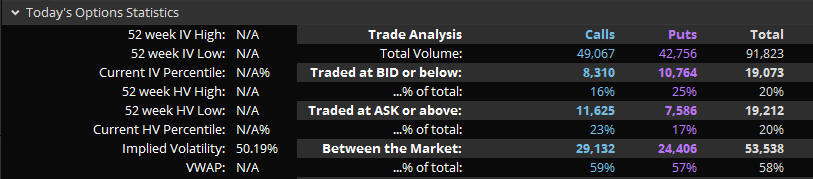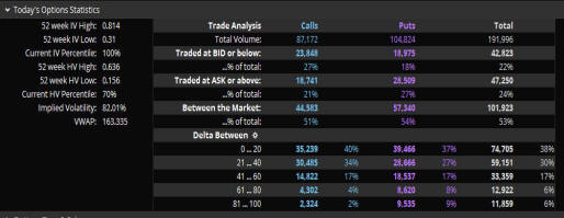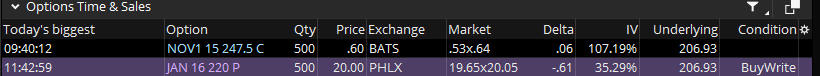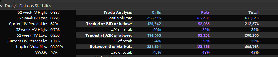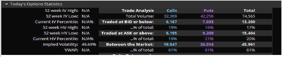 That did not please investors and they headed for the doors dropping the stock another -4.40% today; however, the options barely doubled because the IV is sooo pumped up in this stock the Market Makers will NOT let you make a windfall profit.
