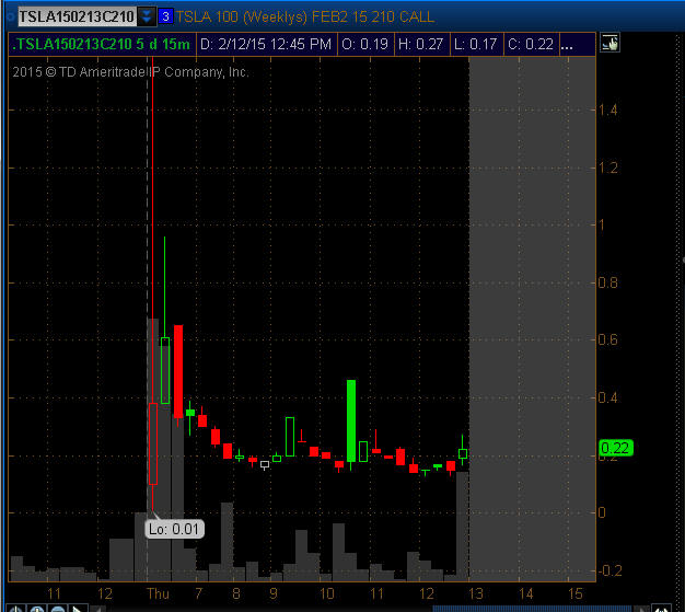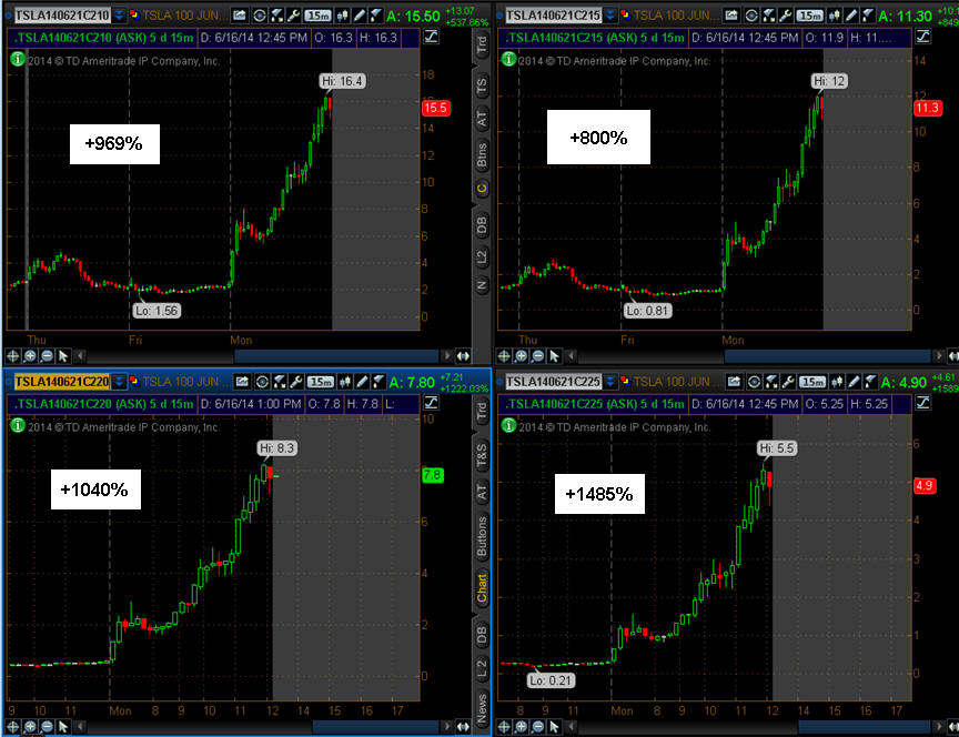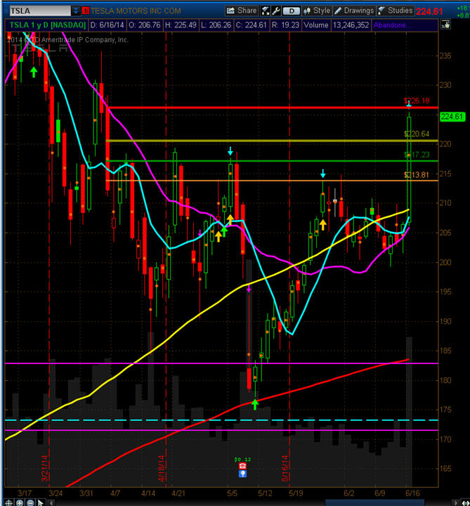 ================================================================================================================= 6/19/14: As I suspected, it was a short squeeze off the news and investors hit the sell button today. I jumped off my Jul calls locking up a nice profit, and now I am fishing for some more once TSLA makes a nice 5% pull back in the next couple of trading days. I certainly hope it's tomorrow because I jumped on some some Lotto 220 puts today because I am not confident TSLA will get down low enough to make my 195 puts any profits. After hours the stock is lower so you may not be able to get in on the 220's at the open so DO NOT CHASE. You may want to fish for some Jun Wk 4 210 Puts because if the selling continues market wide into next week, TSLA is a very high probability trade for a nice bout of profit taking.
