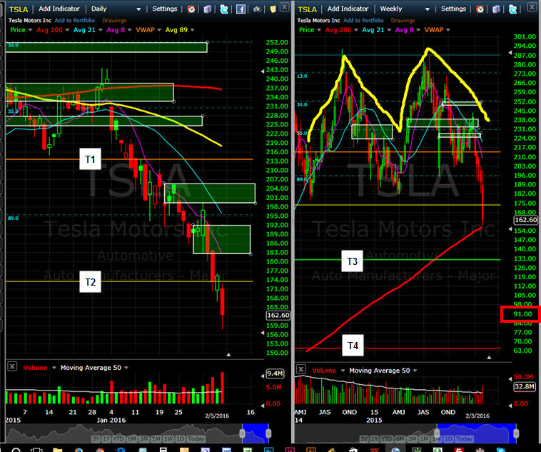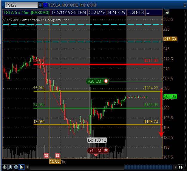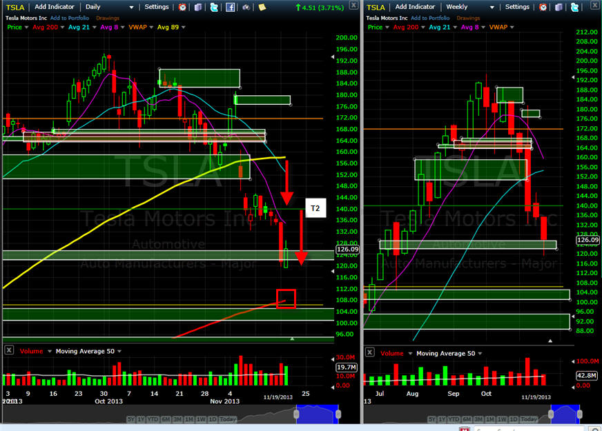 =========================================================================================================== 11/19/13 - TSLA was taken to the woodshed and slammed down on Monday and today the bounce was dead stopped at a 55% retracement. If the stock cannot take out today's high tomorrow in the first 30 minutes and hold it, then the bears will be stepping on the GAS and I will be looking for TSLA to head to the 200MA on the daily chart this week. If TSLA manages to find support here and rises, then I will be looking to short it at T2.