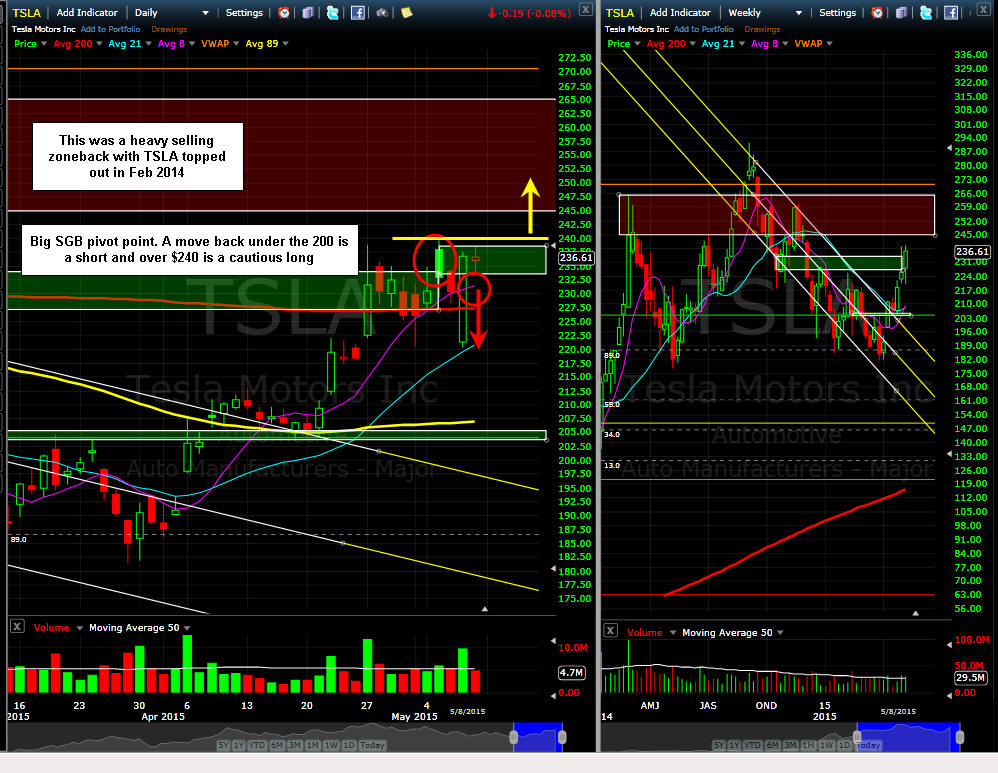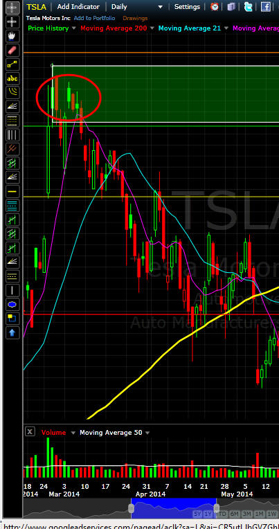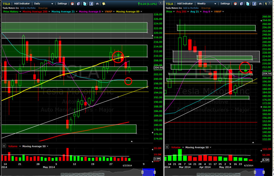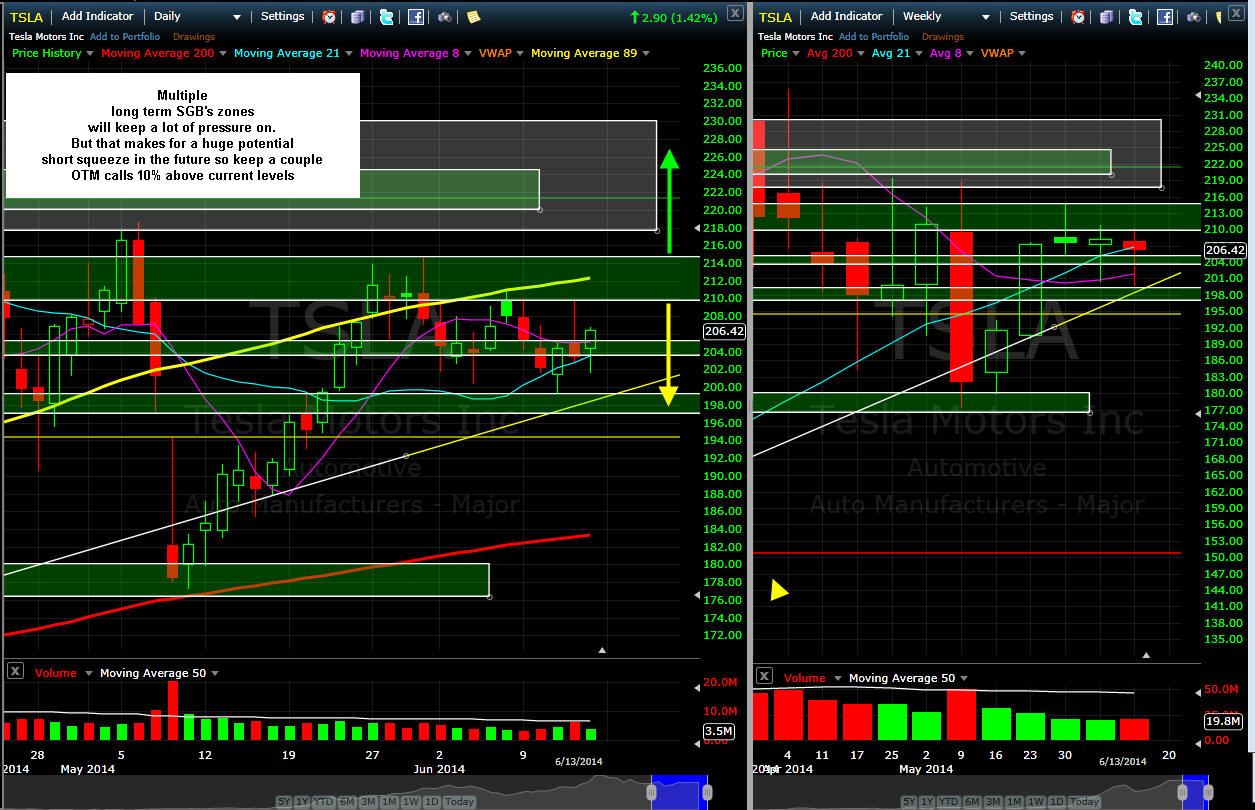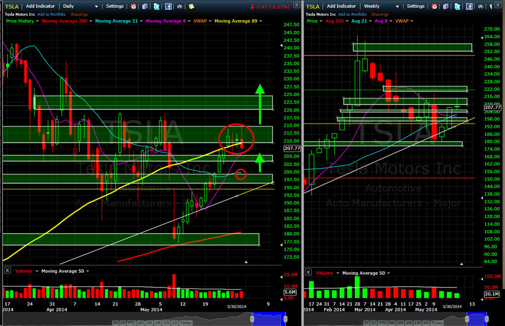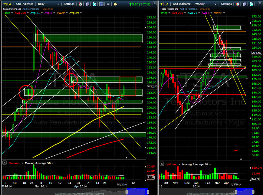 ====================================================================================================== 5/5/14 - So far investors are hitting the long button on TSLA but we have to be aware of the SGB zone above us which will most likely be the stopping point by earnings if this stock cotinues to climb higher. I put on a 215 Straddle today and plan on adding some Lotto Puts and Calls on earnings day before the close.