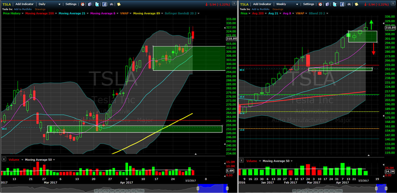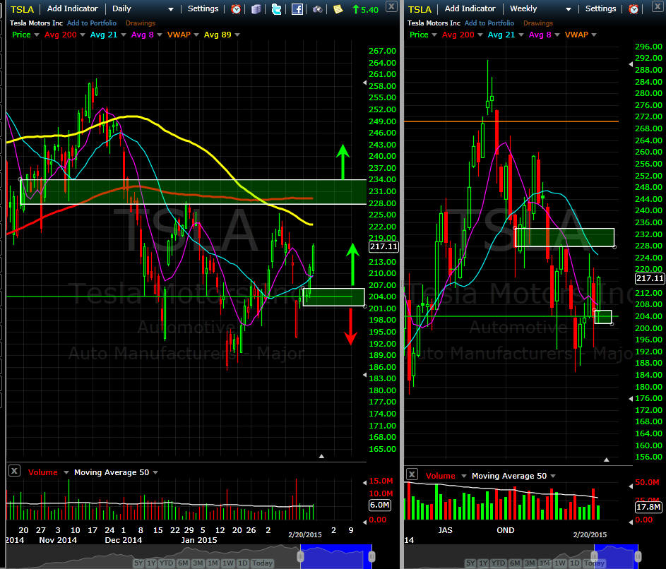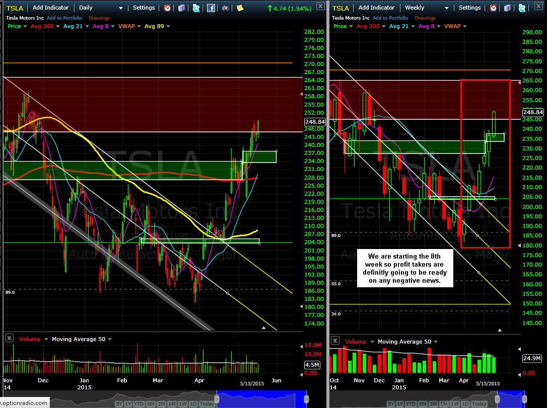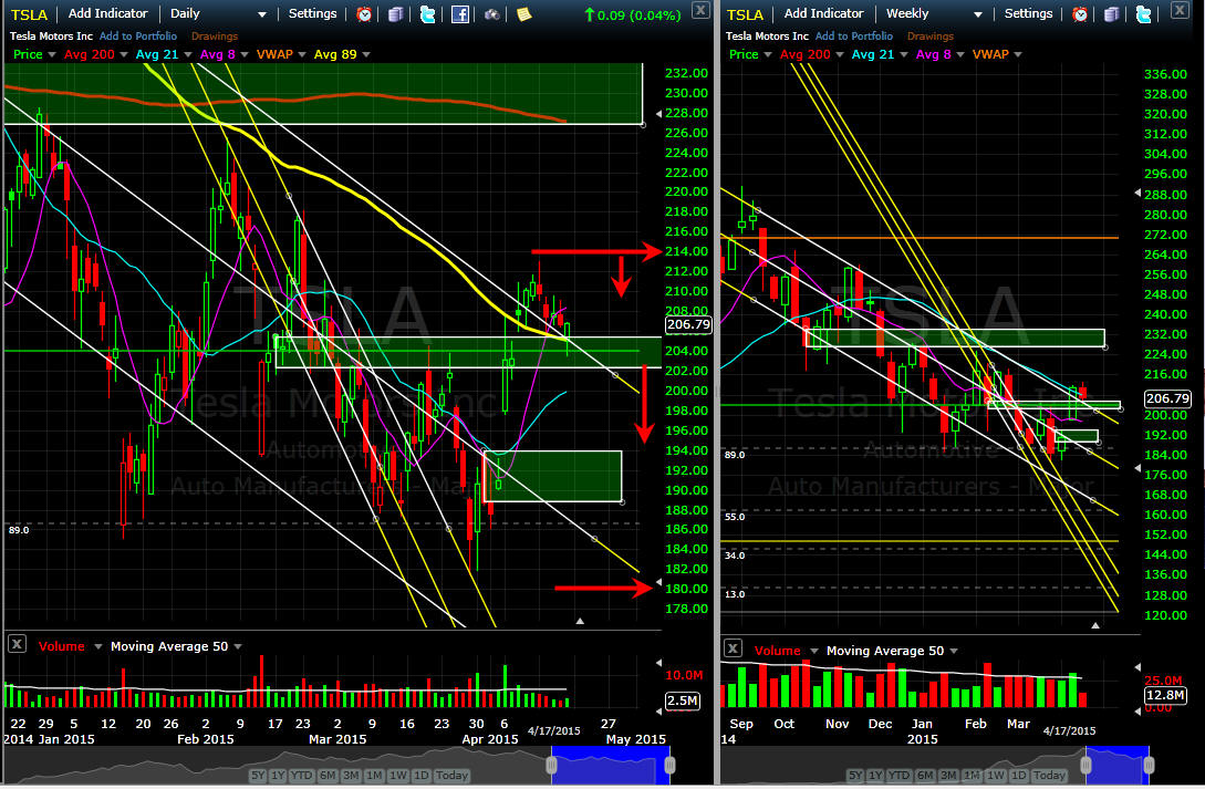====================================================================================================== 5/5/14 - So far investors are hitting the long button on TSLA but we have to be aware of the SGB zone above us which will most likely be the stopping point by earnings if this stock cotinues to climb higher. I put on a 215 Straddle today and plan on adding some Lotto Puts and Calls on earnings day before the close.