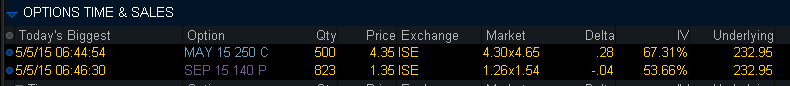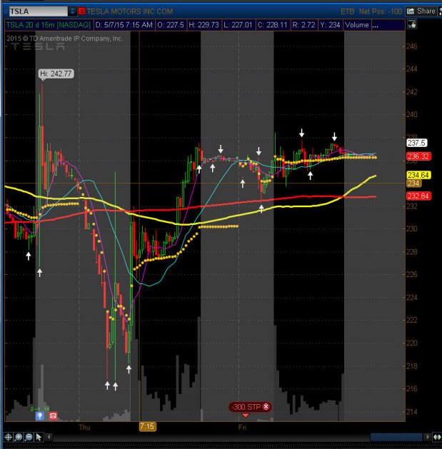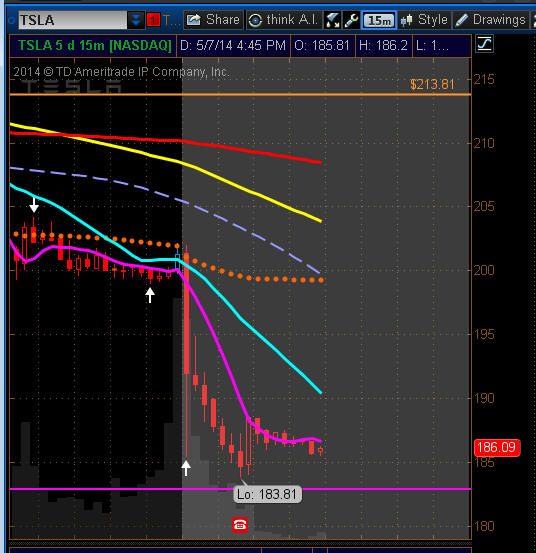 5/7/14 10:52 AM: TSLA is being dumped ahead of today's earnings release. I added some OTM Lotto Puts for the upset and if they miss, we could get a very strong drop tomorrow. I will be looking for a White Whale play tomorrow as well.