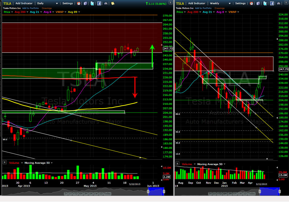 ================================================================================================================= 11/15/14: Bears must be heading into hibernation? The SGB's were ignored and TSLA took off this week with two powerful days of advancement. I am still suspect on this higher move, but you cannot find the trend so my plan is to fish for a Bear Call Spread at T2 and I will get some long calls if the stock falls back and HOLDS on a close above $250 or the 89MA on the daily chart. I was filled on both BCS and I have the BPS in play so I am hedged for the time being and plan to take profits on the BPS if TSLA advances next week to T2.