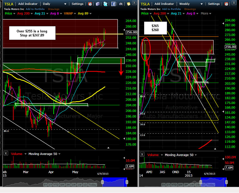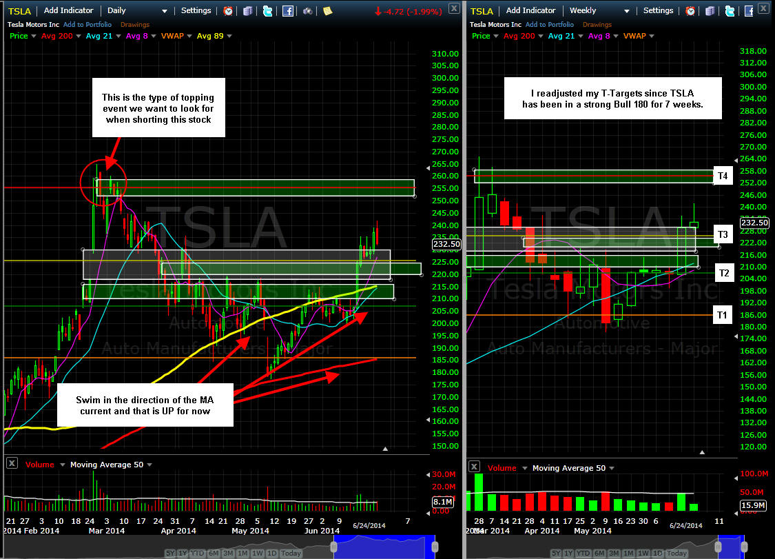 ============================================================================================================= 6/29/14: I cannot seem to get a handle on trading TSLA right now so I am flat and will wait until we get closer to earnings. ==================================================================================================================== 6/24/14: TSLA is losing some momentum today but until it takes out the SGB it is still a good candidate to keep moving higher. I just do not want to aggressive short this stock as I have been burned too many times in the past year. I am sure I will have my day on the short side, but when a stock is loved, you just have to fish for long plays on dips. As long as TSLA has the moving averages in upward momentum I look for long plays on dips and quick short trades on spikes or wait a couple of days after a news event to get some inflated profit taking. I am still fishing for the extreme dip so I can get a cheap price on long calls.