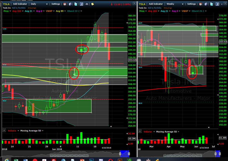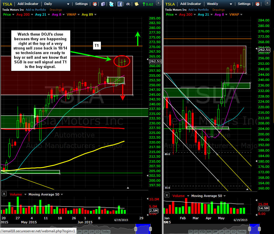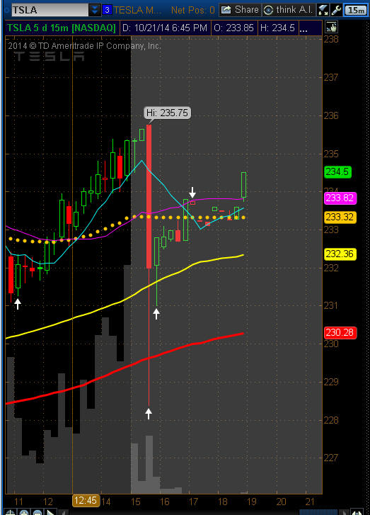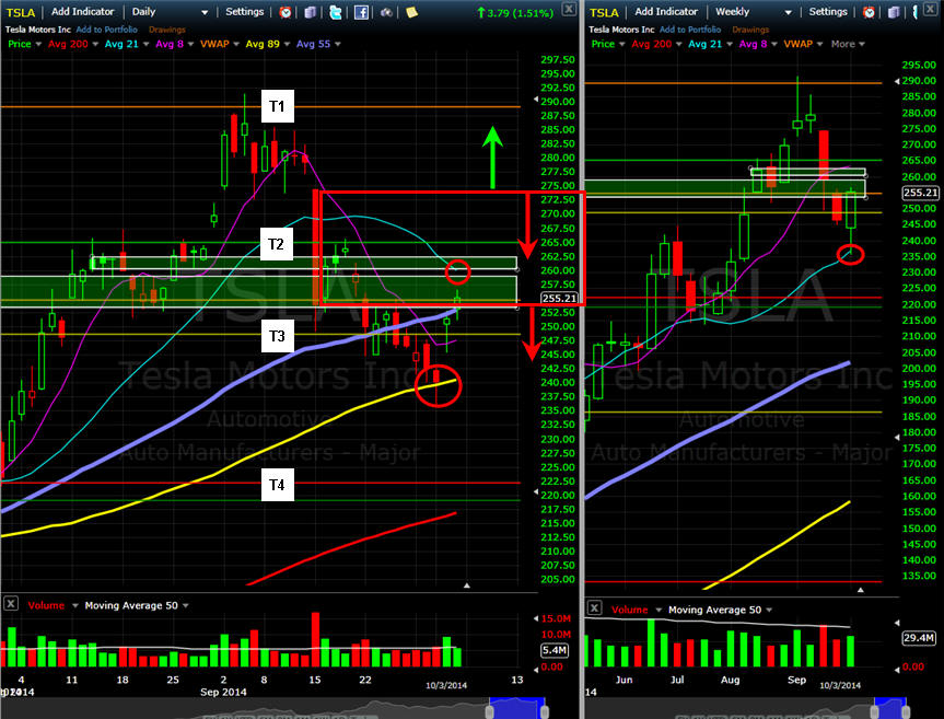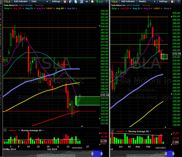 ======================================================================================================= 10/5/14: Testing the SGB zones and about to get filled on my Lotto Puts. I am still fishing for the Bear Call Spread, but now that the stock bounced off the 89MA and is trading above the 55MA on the daily chart, we still have the potential for a continuation to the upside; however, until that huge Bear Elephant bar is take out, I will maintain my bearish stance on TSLA.
