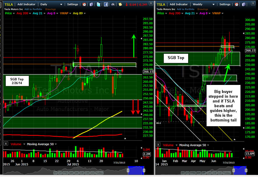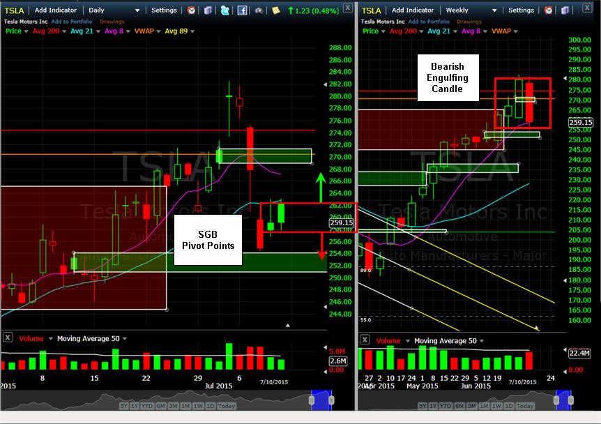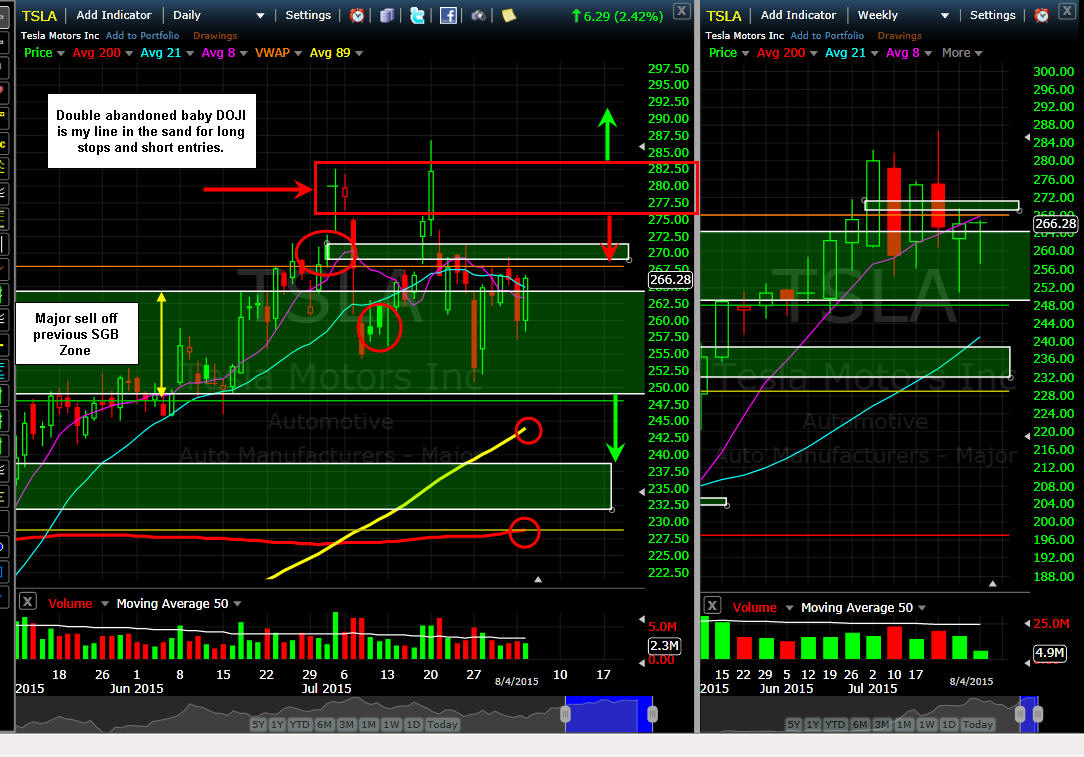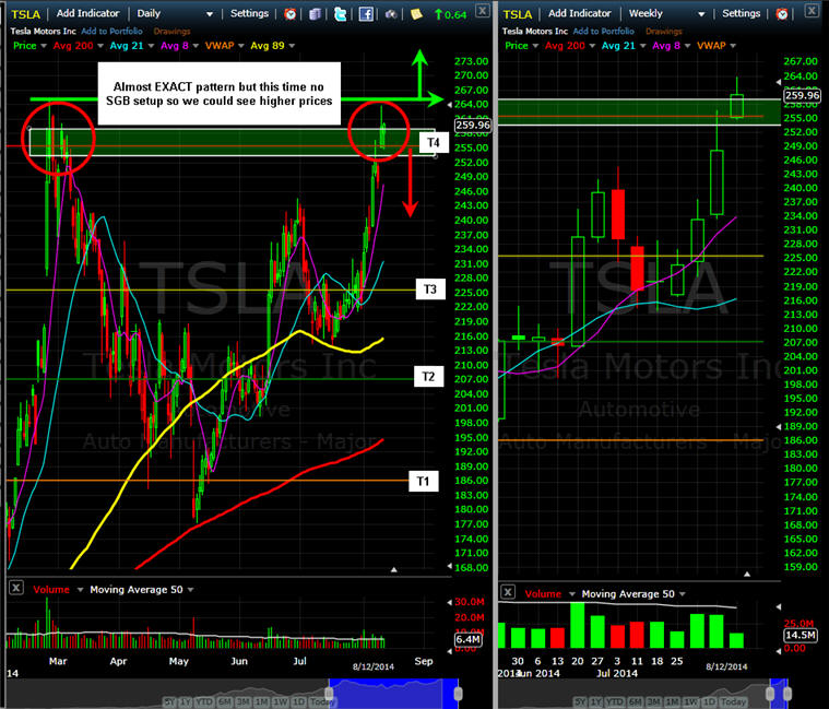 =========================================================================================================== 8/14/14: Ah yes, we get the infamous SGB's heading into expiration and now it's decision time. We have old SGB zones that proved to be strong short signals and now we have two more back to back SGB's above that old zone which is the pivot point for me. This stock is hot, loved, and the future is extremely promising for TSLA. Picking spots is the hard part of trading but with options, you have the opportunity to pick both directions. The only thing is, you need the stock to move far enough to cover the losing side and TSLA certainly can do that. The other way to play is sell premium spreads and define your risk. I plan on testing these SGB with some weekly options on both sides. I am going to fish for some Sep puts if TSLA breaks to the higher side.