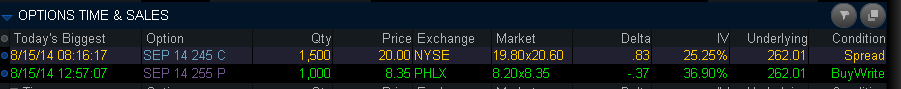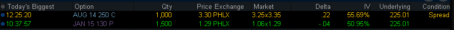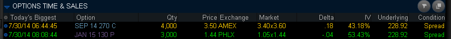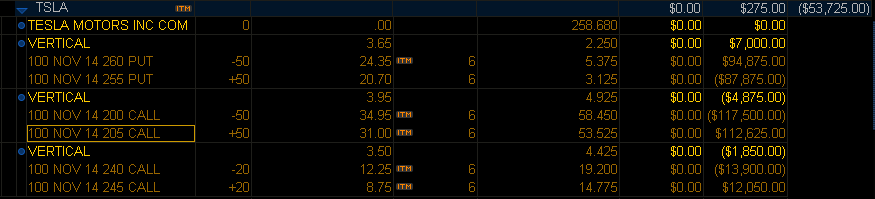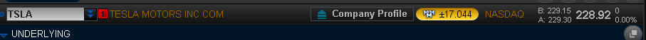 ================================================================================================ 7/30/14: Tomorrow is the big day for TSLA and whatever the outcome get ready for some action on Friday! Expected MMM is higher now at +/- 17.04 and the IV on the weekly options is a whipping 126% so selling spreads outside the MMM is a good bet. I got a better entry on the calls at the open, but the puts did not move down enough even though TSLA moved up, so so that indicates to me the stock has a higher probability of moving a lot lower if they miss.