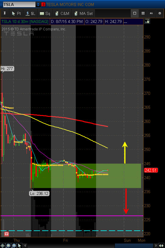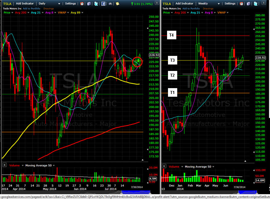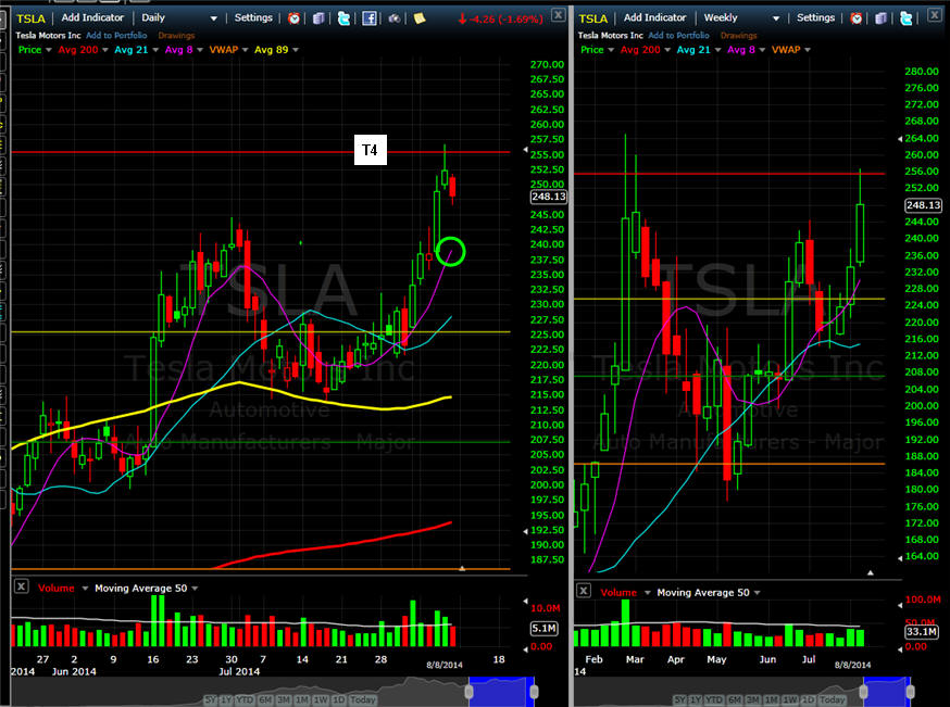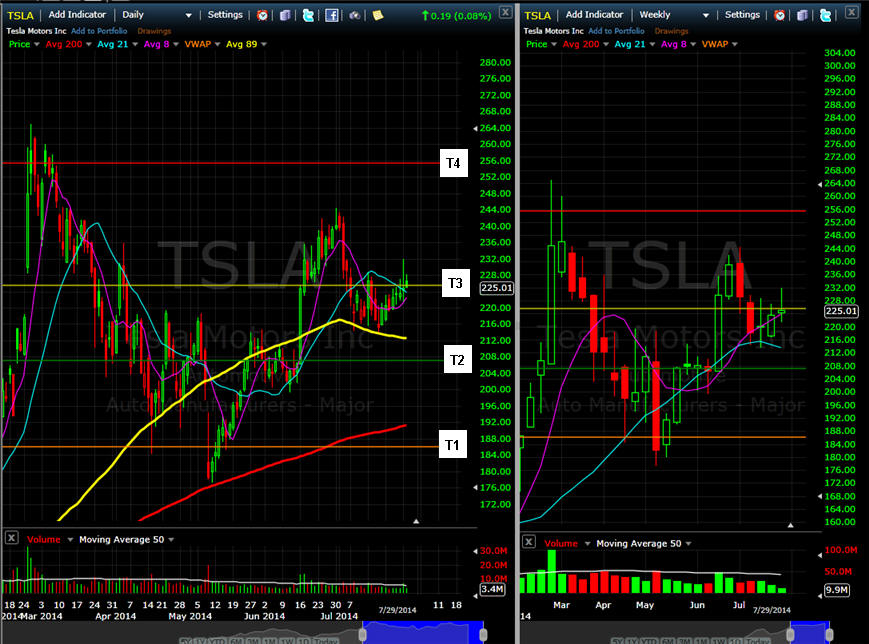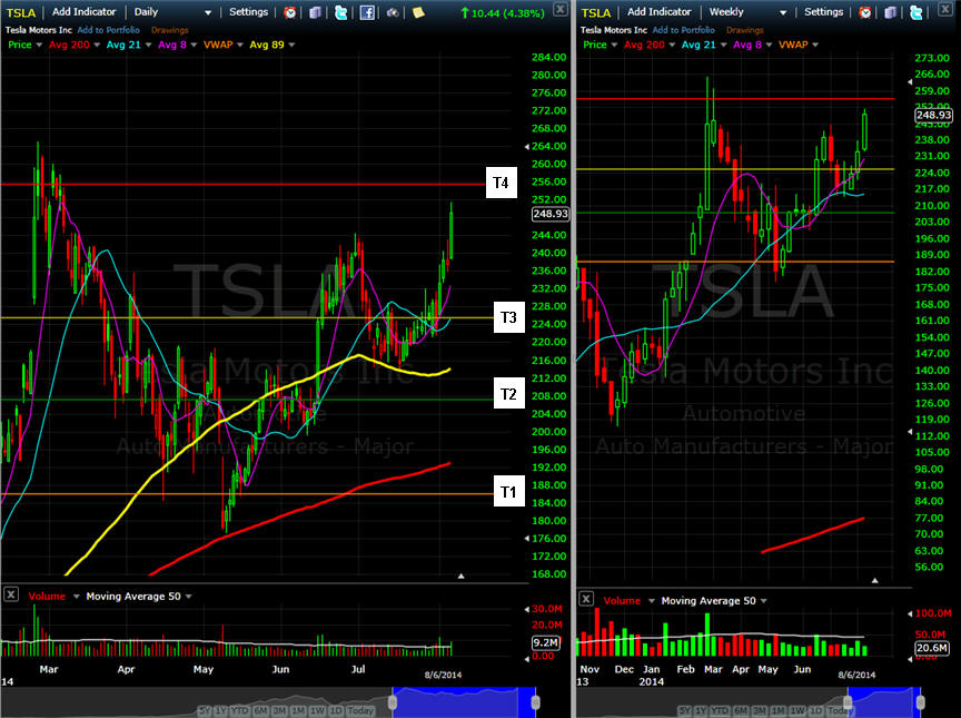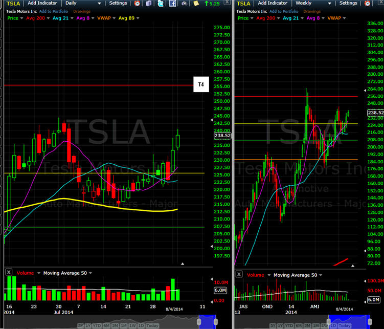 =========================================================================================================== 8/5/14: Looking for TSLA to move up to my T4 or at least $250 to be hit over the next week or two so long as we do not see a SGB.