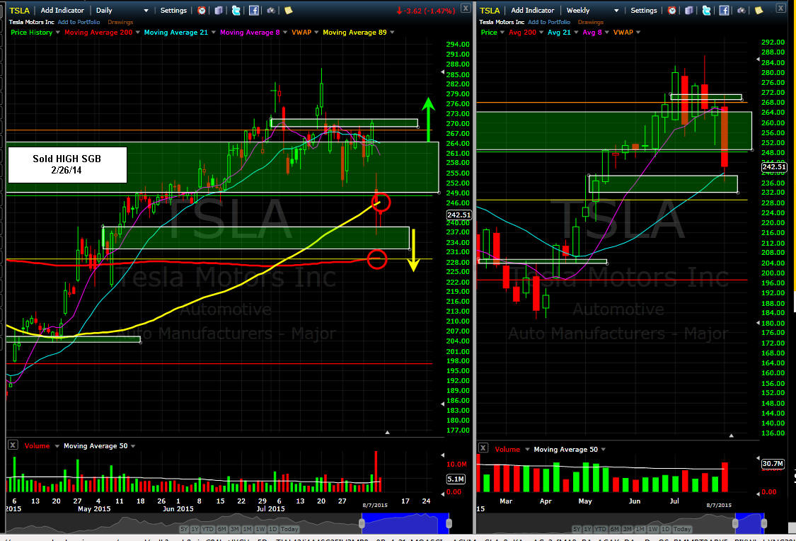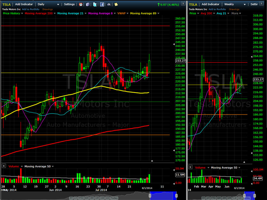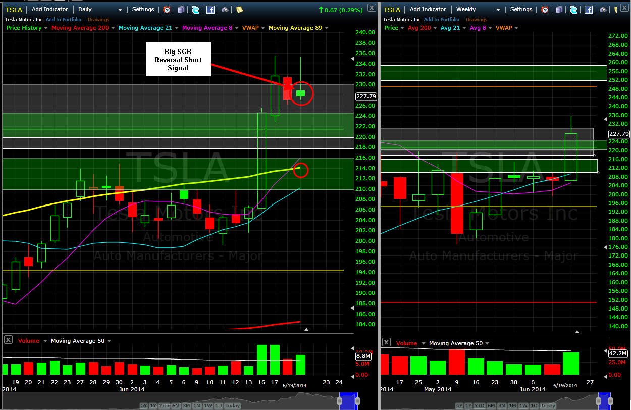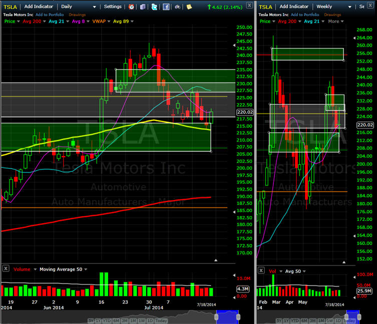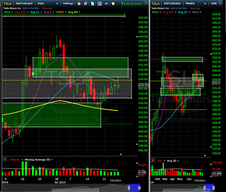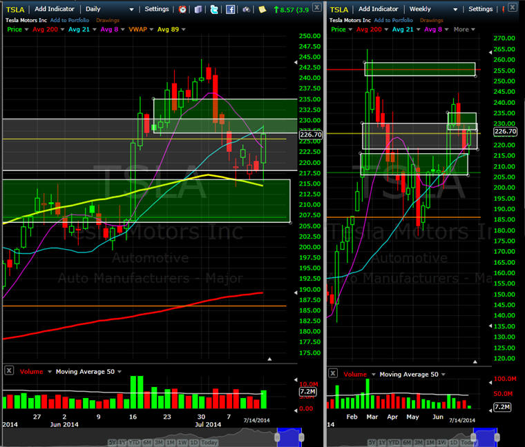 ================================================================================================================ 7/20/14: Second test of the 89MA held, and if the markets rally off strong earnings reports this week, TSLA is poised to make some moves back to the SGB zone at $230.00. IF the stock falls back to the 89MA I will do some Bear Call Spreads.