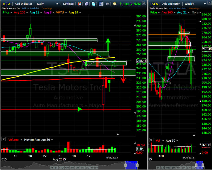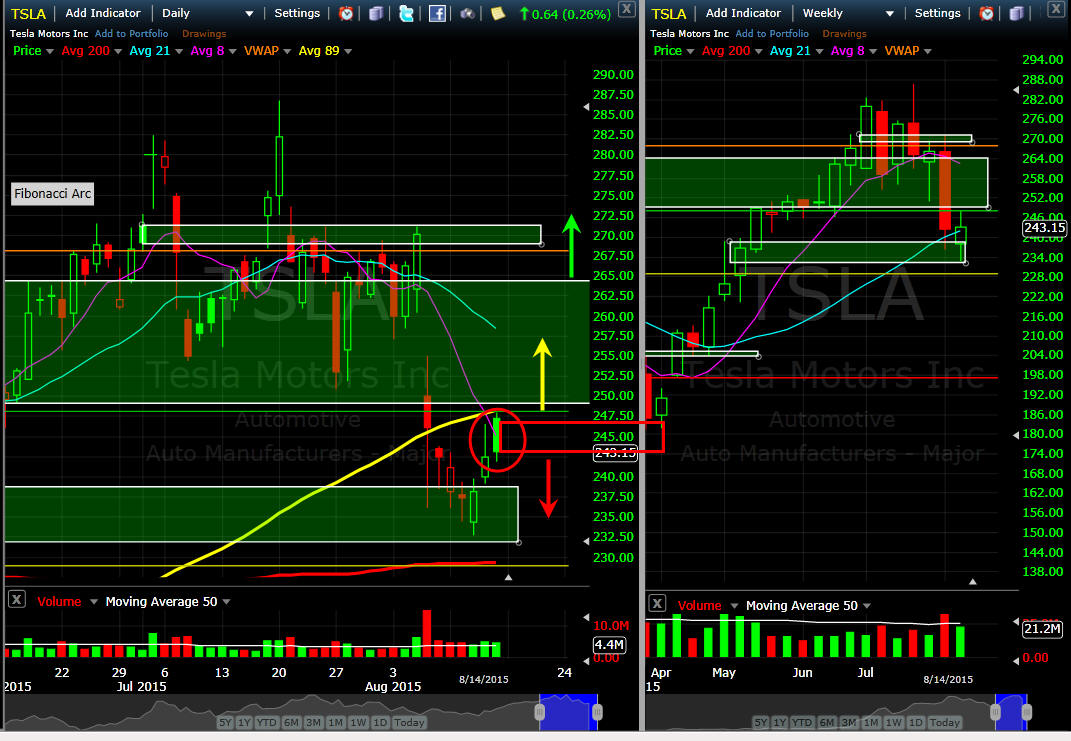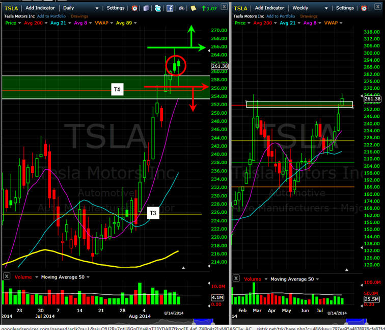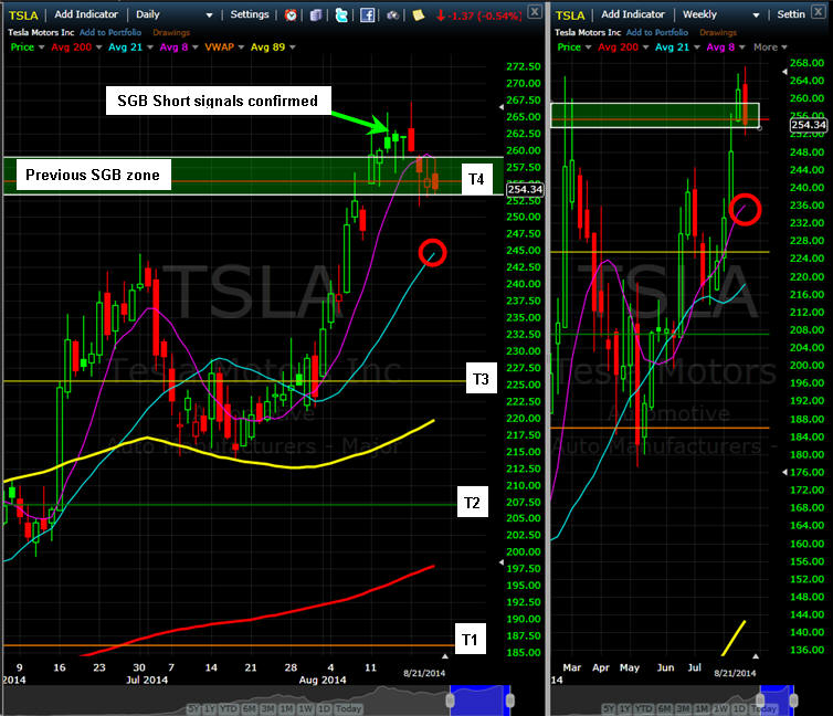 ==================================================================================================================== 8/21/14: LOL, that "higher" move I was looking for was nothing more than an opportunity to get SHORT and that is exactly what investors did. Now that TSLA is trading UNDER the recent SGB's it dead stopped today on the old SGB zone that took it down from $256.00 to 188.00. I do not think that will happen again, but you just never know so we trade what the stock gives us and make our profits along the way. With the stock closing under my T4, I am looking for T3 to be the likely low side target. Now we know TSLA is a much loved stock with massive upside potential. The future compelling news is extremely strong and that will keep optimistic investors chomping at the bit to buy any and all dips. The first short term target will be the 21MA on the daily chart and/or the 8MA on the weekly chart. If TSLA does manage a move back over T4, then I am looking for long plays over $260.00. I have been fishing for the 250 puts, but it only came down to $5.15 so I have not gotten filled yet.